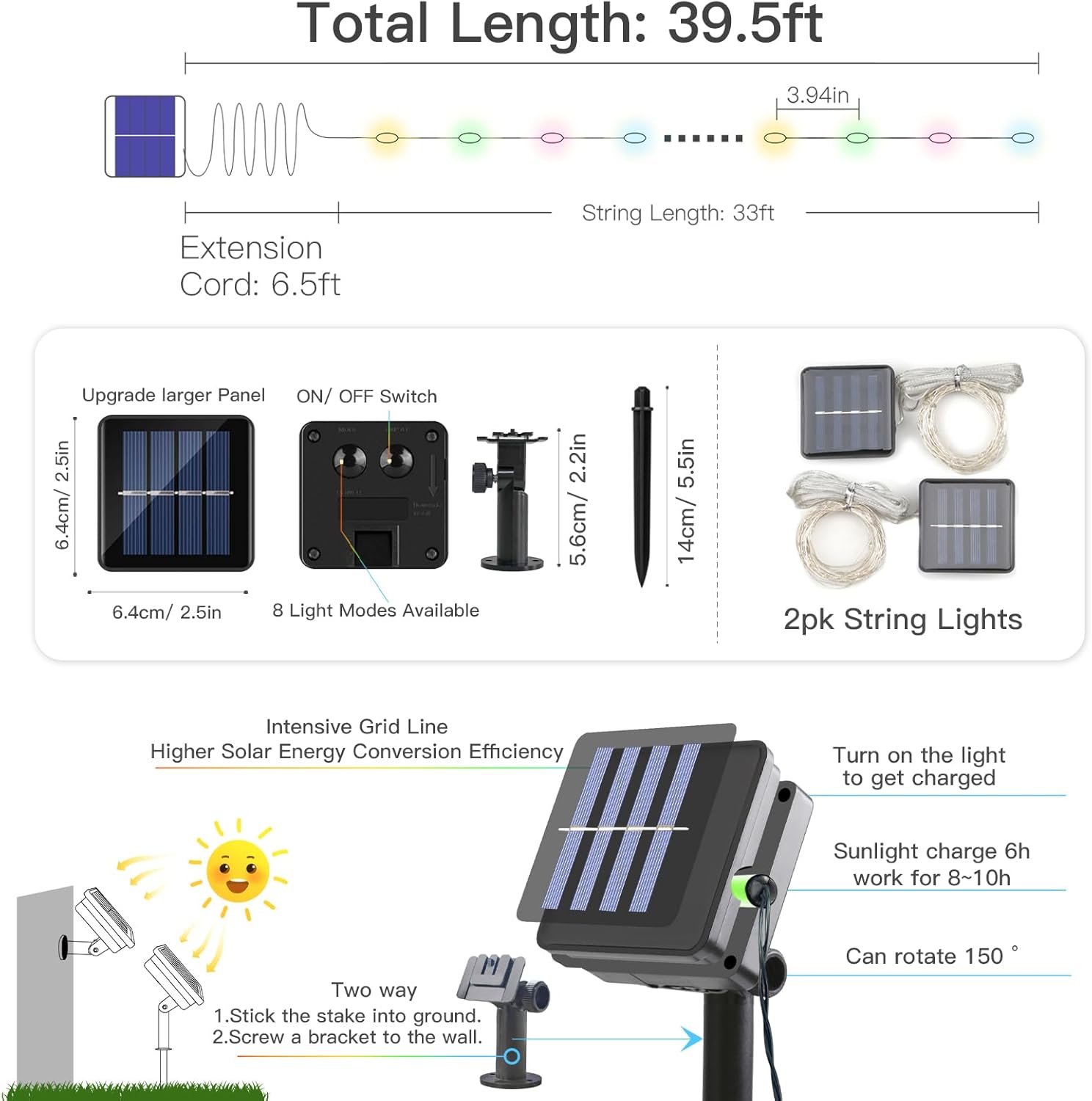 • 2 PACK & SIZE: SUDDUS solar camping string lights come with 2 packs of string lights. Each string is 33 feet long with 100 led bulbs 3.94 inches spaced apart. Two strings' total length is 66 feet. The extension cord is 6.6-feet between the panel and the first bulb.