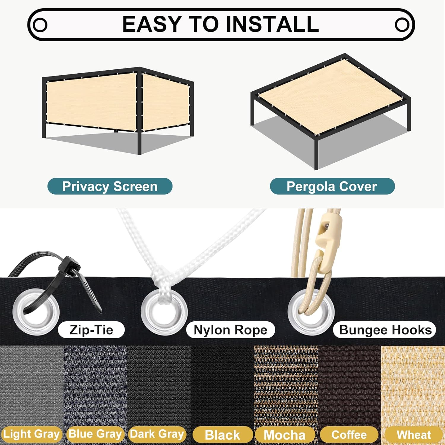 • Accessory Updated: Accessories have been updated from [Zip-ties, Ropes, Bungee Balls] to [Zip-ties, Ropes, Bungee Hooks]. Both versions are in circulation and will be shipped randomly. Easy to Install: With included grommets on each sides every 2 ft space and fixing accessories, you can easily attach the pergola shade cover to various structures while ensuring uniform stress. Whether you're looking to cover your backyard, carport, or playground, you can have it up and providing shade in no time