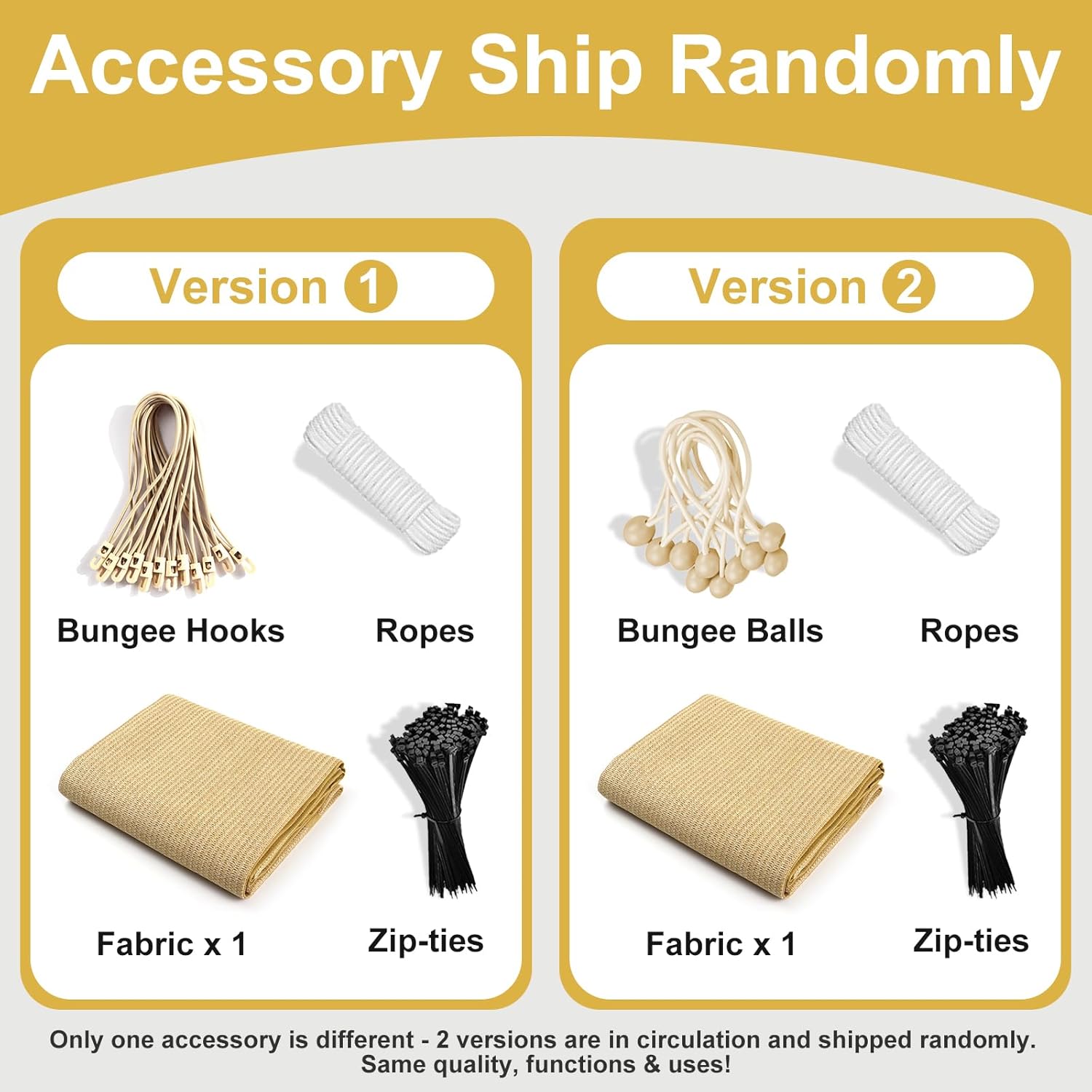 • Accessory Updated: Accessories have been updated from [Zip-ties, Ropes, Bungee Balls] to [Zip-ties, Ropes, Bungee Hooks]. Both versions are in circulation and will be shipped randomly. Easy to Install: With included grommets on each sides every 2 ft space and fixing accessories, you can easily attach the pergola shade cover to various structures while ensuring uniform stress. Whether you're looking to cover your backyard, carport, or playground, you can have it up and providing shade in no time