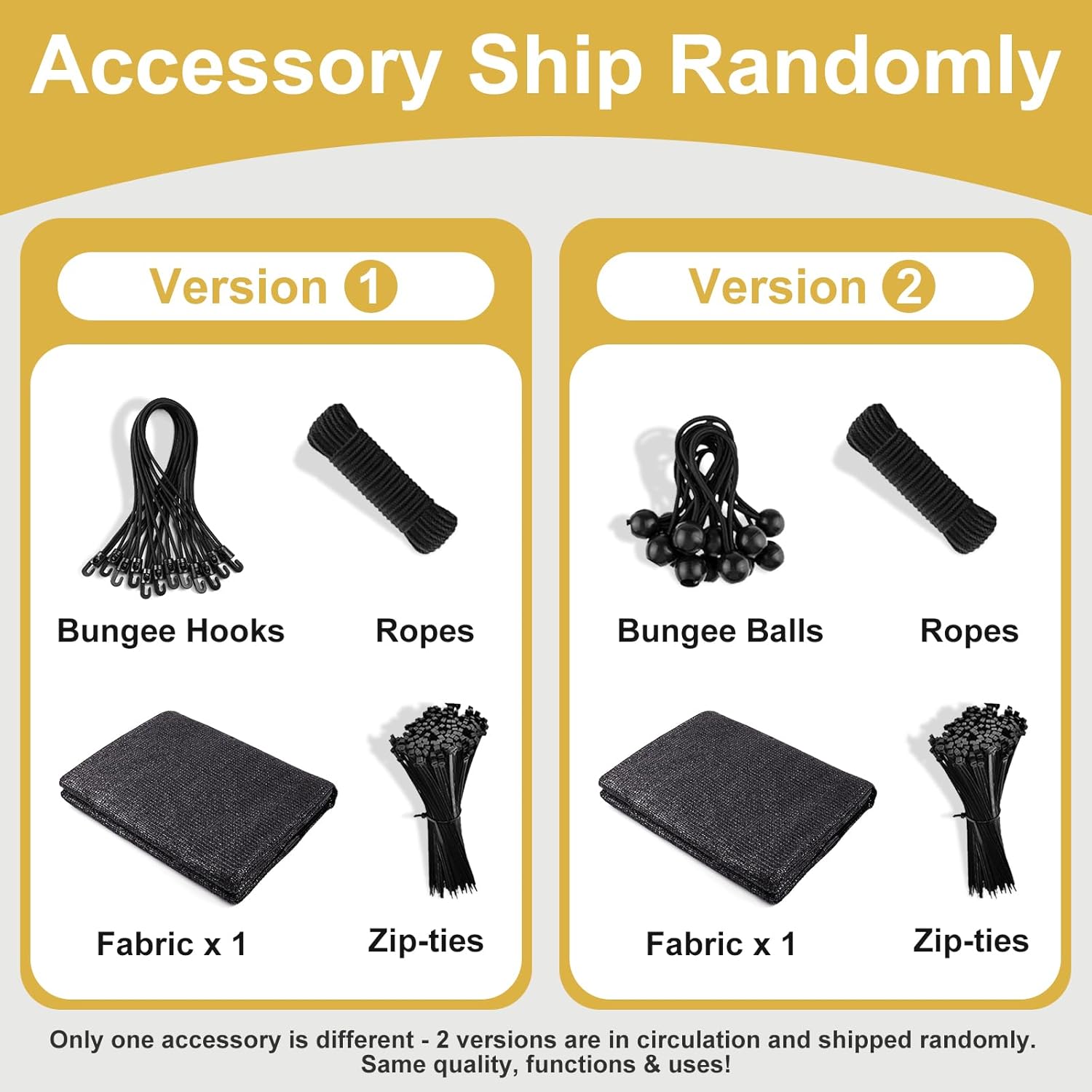 • Accessory Updated: Accessories have been updated from [Zip-ties, Ropes, Bungee Balls] to [Zip-ties, Ropes, Bungee Hooks]. Both versions are in circulation and will be shipped randomly. Easy to Install: With included grommets on each sides every 2 ft space and fixing accessories, you can easily attach the pergola shade cover to various structures while ensuring uniform stress. Whether you're looking to cover your backyard, carport, or playground, you can have it up and providing shade in no time