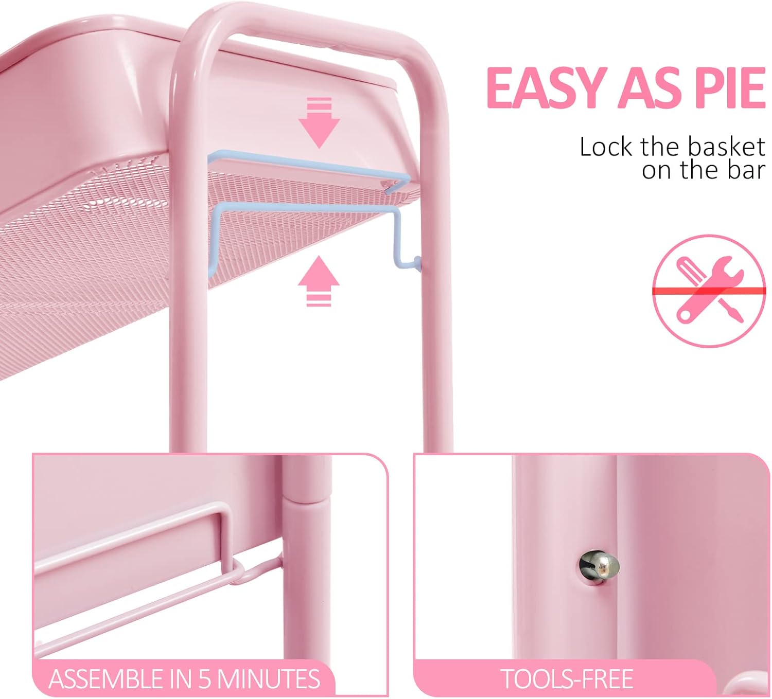 • 【Easy Assembly & Sturdy Built】This Toolf rolling cart in pink is easy to assemble. The cart doesn't require any screw and take only minutes to install. The heavy-duty metal frame and rust-resistant coating makes it even more durable. The bathroom cart can hold up to total 132lbs.