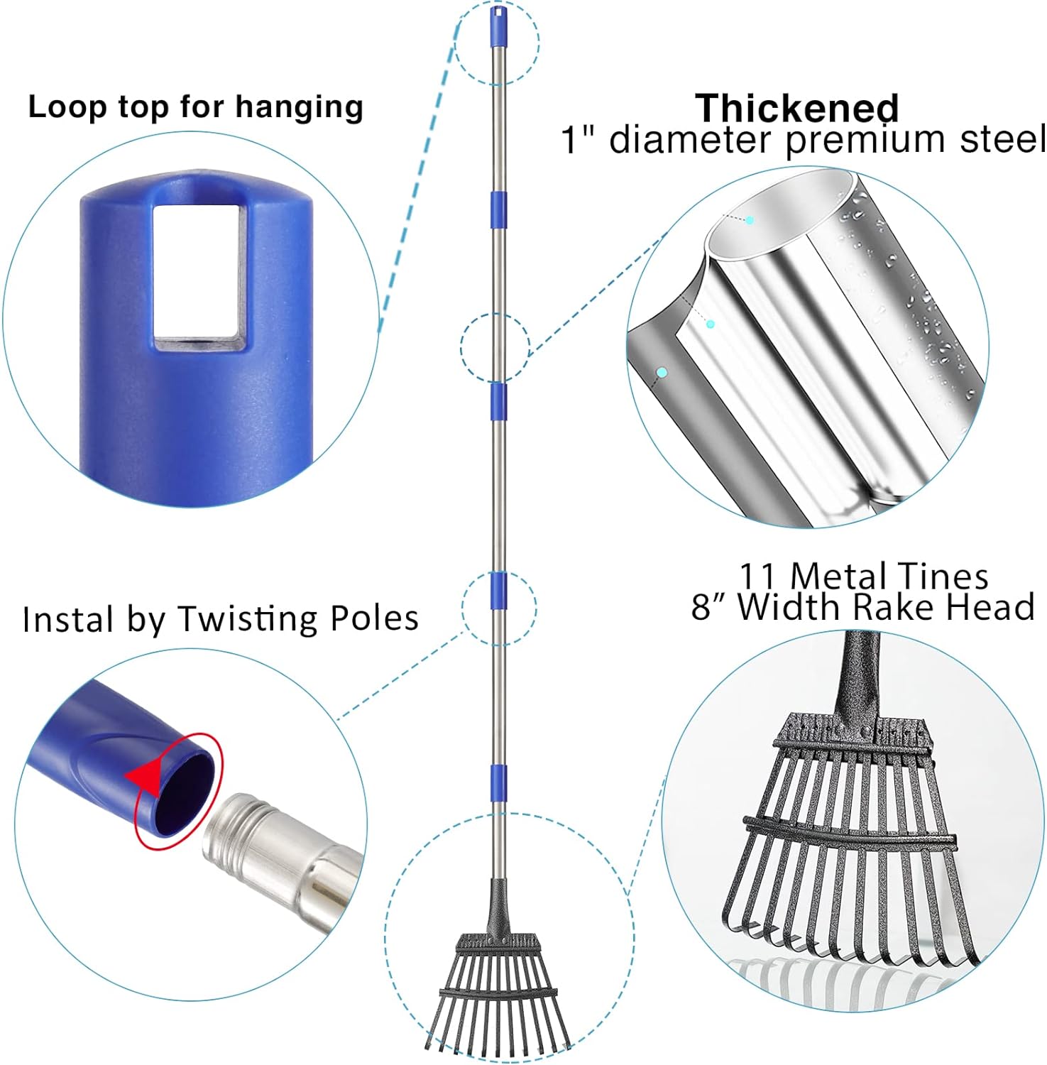 • 11 sturdy metal tines head will help you easily clean all kinds of leaves, pine needles, small debris, grass clippings under hedges, flower beds, chicken coops, narrow areas without damaging plant feeder roots.