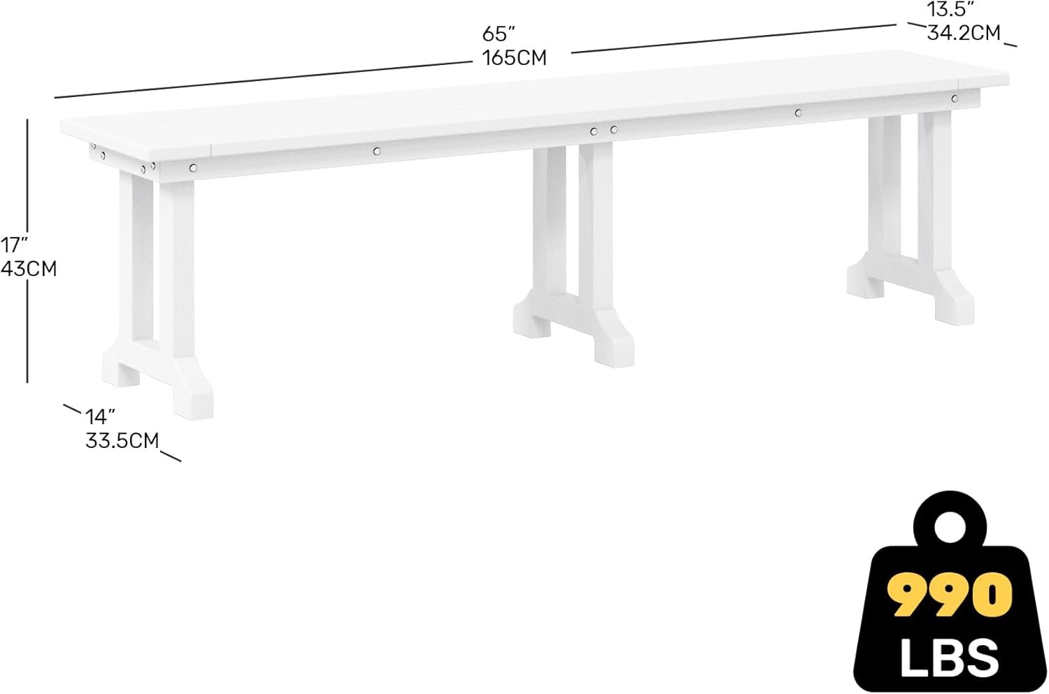 • Bench Specs - Overall: 13.4"D x 65"W x 17"H. Weight: 42 lbs. Weight Capacity 660 lbs. All assembly hardware and a easy-to-follow instruction manual are included in every box.