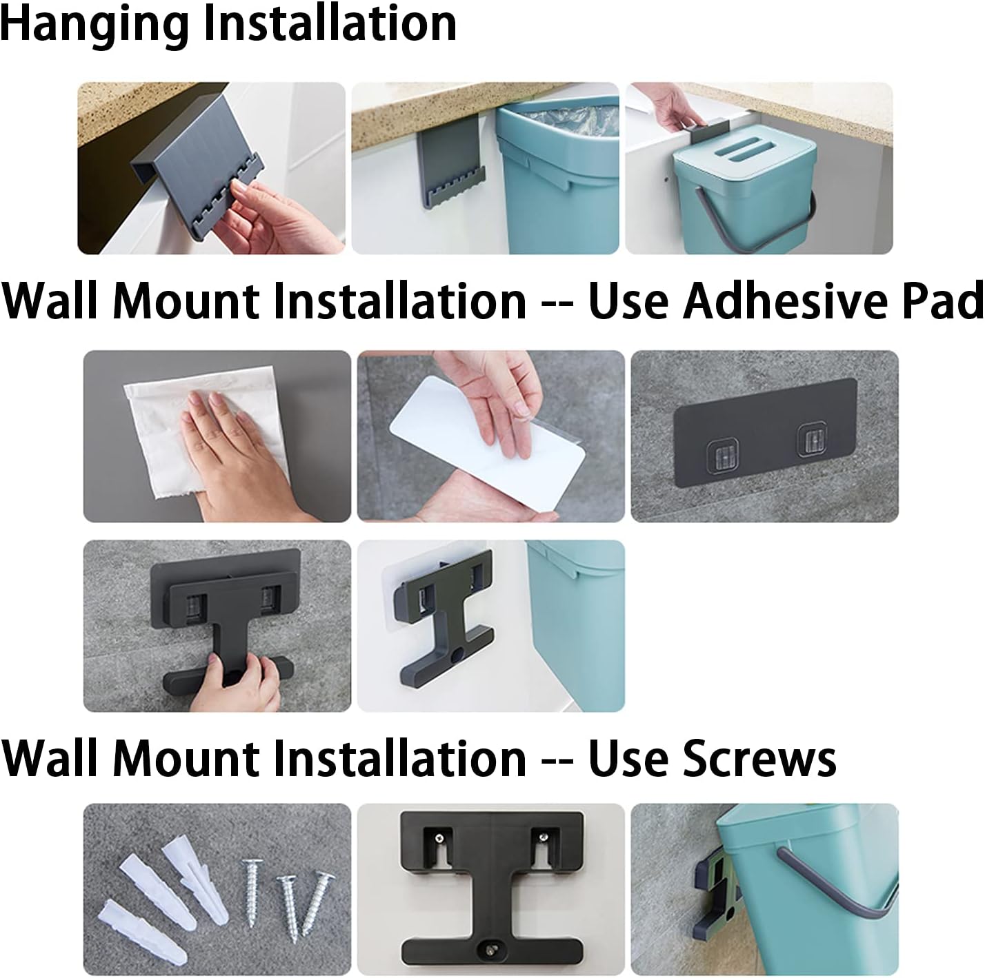 • Two Installation Options : Our kitchen trash bin can easily hang on the cupboard door with mount accessory included.It also can be hung on the wall by adhesive tape.You can use it as an under sink kitchen trash can, a wall-mount trash can, a countertop compost bin.