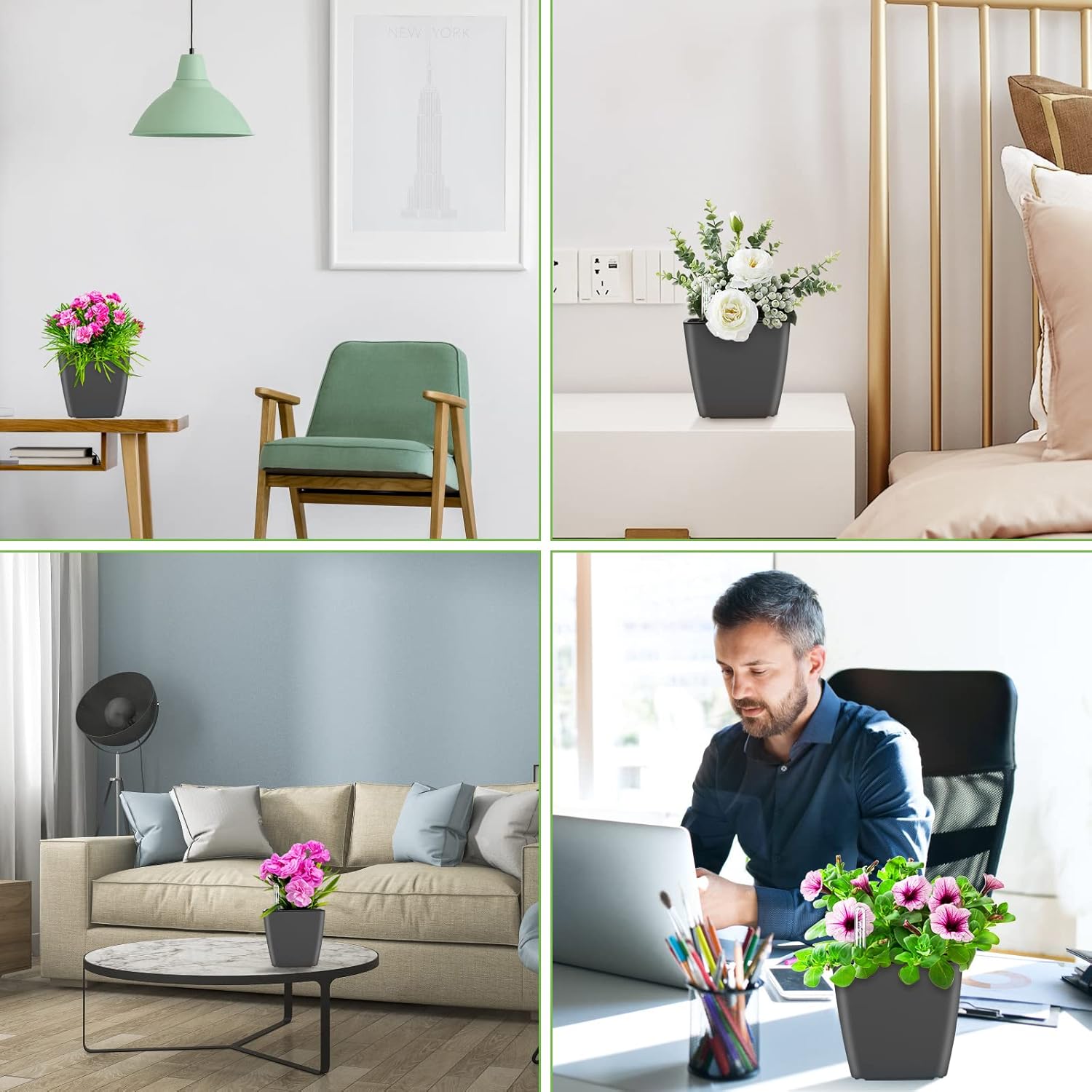 • GS Garden Self-Watering Planter Pots are made of high quality virgin material and recycled material and treated by ultra-high temperature and high pressure no bacteria process size 5.2 X 5.2 inch in wide 4.72 inch in high set of 3 plant pots.(Plants in pictures are for reference only Product does not contain plants)