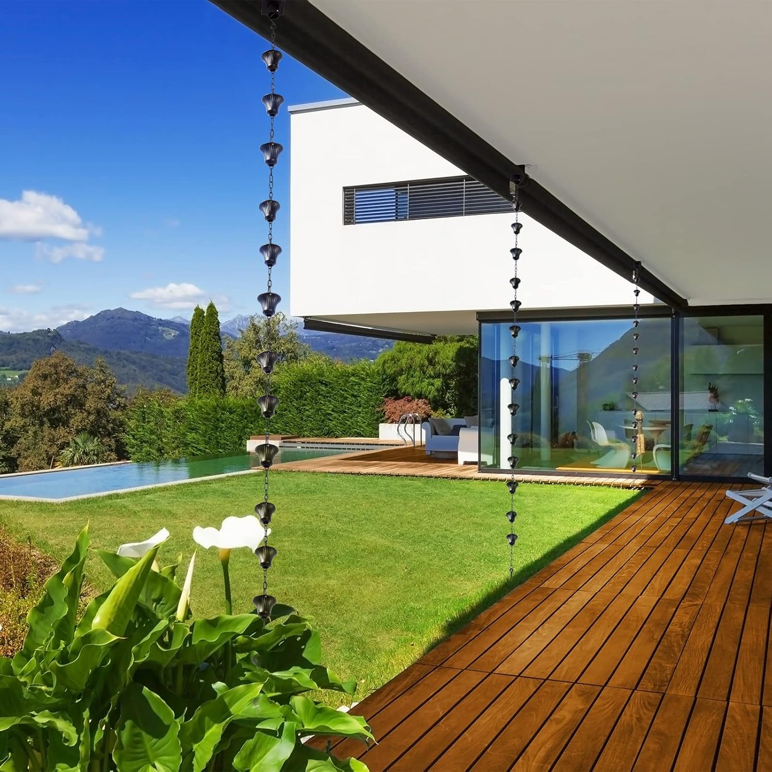 • Solid and Durable Rainwater Chain. The rain chains for downspouts is made of high quality wrought iron metal that is rust resistant and provides long term durability and stability. Avoid splashing water around ,The surface is sandblasted granular black to provide an attractive cottage-style look to your yard.
