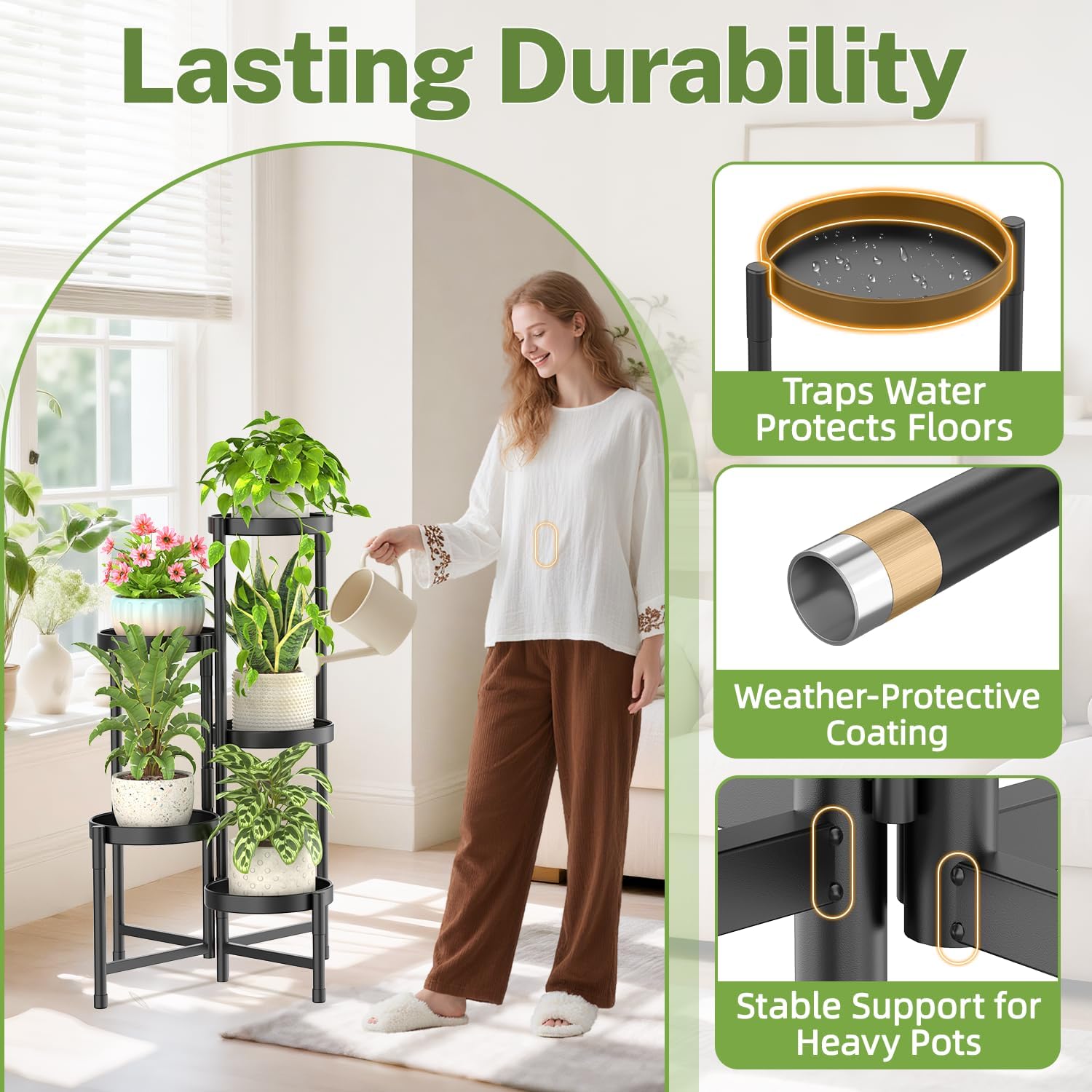 • Stable Triangular Support Legs: The metal plant stand is designed with a center pole that does not touch the floor, while outer legs form a stable triangular structure. Each ground-touching leg comes with protective caps to prevent scratches on floors