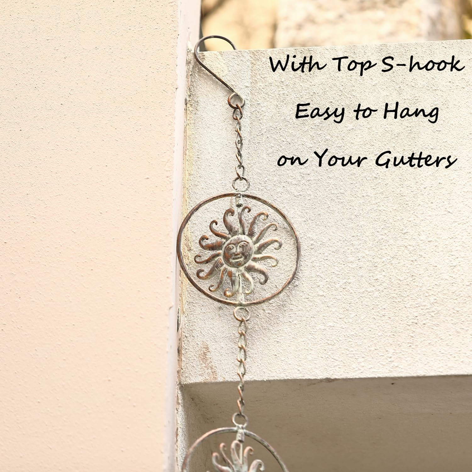 Sun Face Rain Chains, 8.5 Feet Length, Rain Gutter Chains, Functional and Decorative Replacement for Gutter Downspouts, Metal Loop Rain Catcher Chain, Rain Chains for Outside Garden Balcony Porch