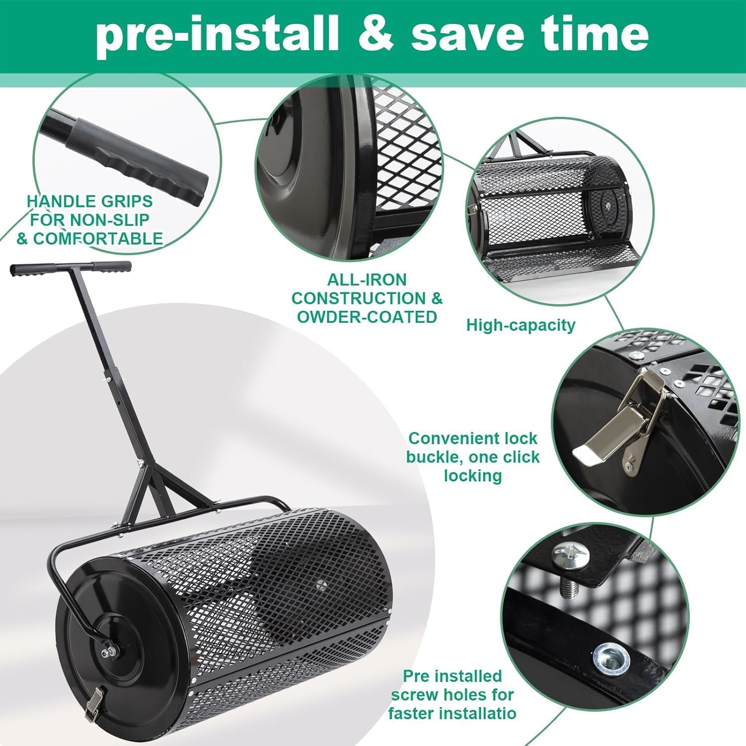 • 27" Peat Moss Spreader: Dense diamond mesh allows peat moss and soil to spread evenly and consistently across your lawn or garden; rollers evenly distribute any fertilizer material for a more lush lawn or garden.