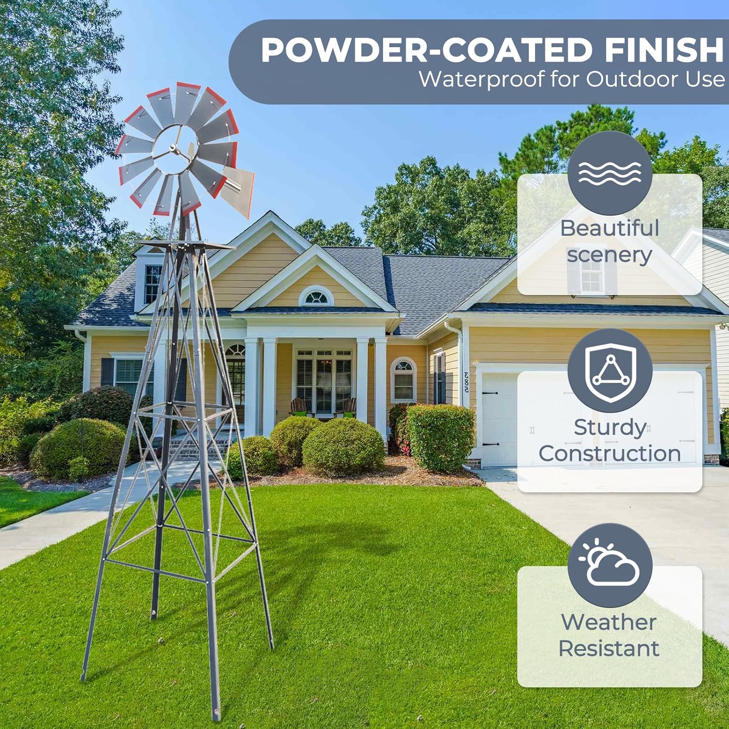 • 【DURABLE USE】No need electric. This windmill for yard is turned by the wind power. Uses roller bearings to keep windmill blades turning smoothly and quietly with the wind