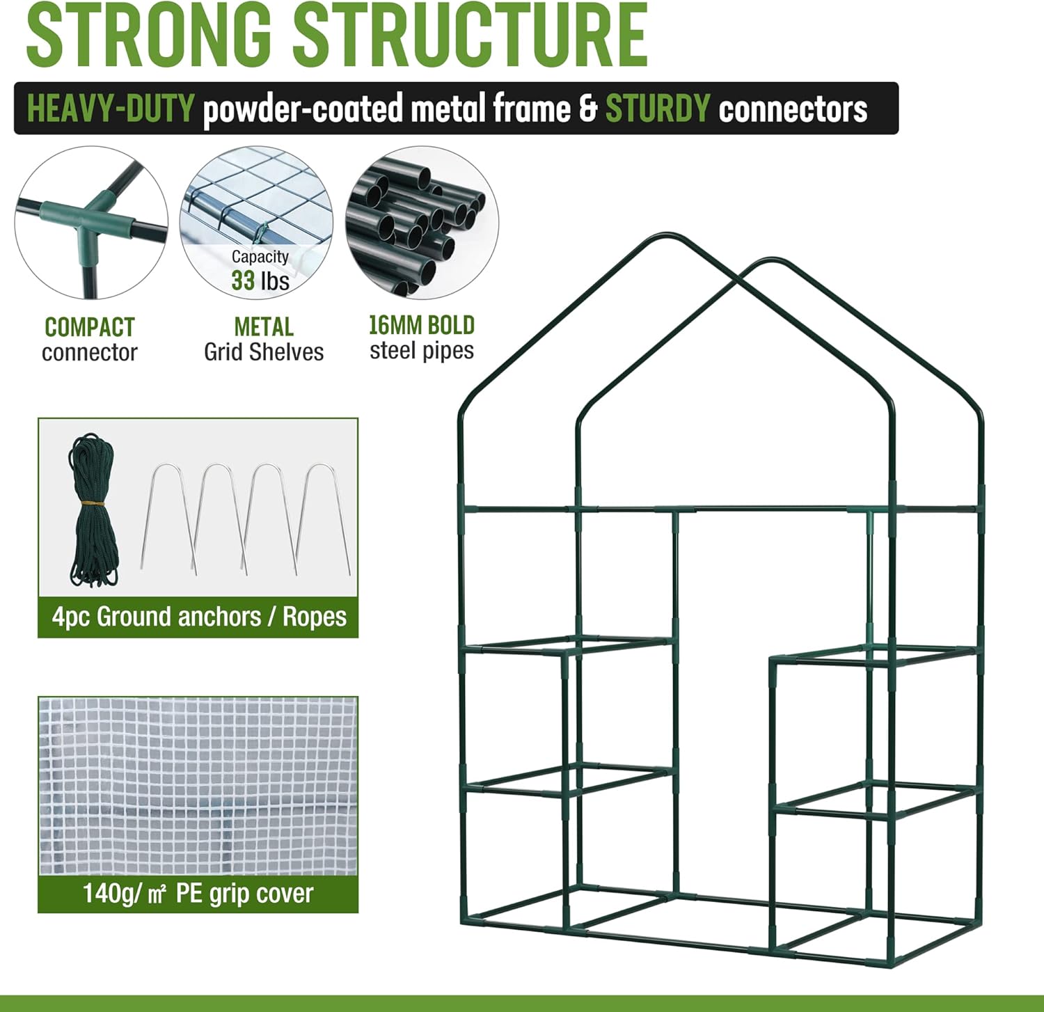 • Strong Structure: Green houses for outside heavy duty built with heavy-duty powder-coated metal frame and reinforced thick (140g/㎡) water-proof PE cover. Two bearing shelves on each side are enough to hold more seed trays, pots, and plants. There are straps at the four corners to attach to the frame to enhance stability. Additionally, the reinforced PE cover of the greenhouse cabinet is stronger and thicker than standard PVC to reinforce the frame while promoting healthy plant growth.