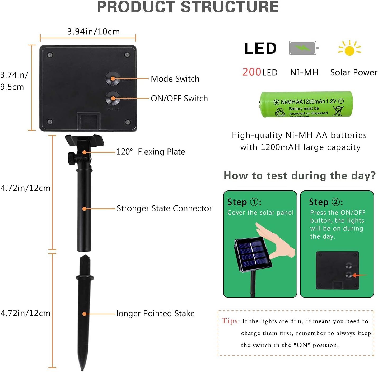 • 8 Lighting Modes, Memory Function and Auto On/Off: These solar twinkle lights have the on/off button and mode button. You can select 8 different modes to satisfy your diverse needs by pressing the mode button.And the built-in memory chip saves your last modes setting, so there is no need to reset it again.