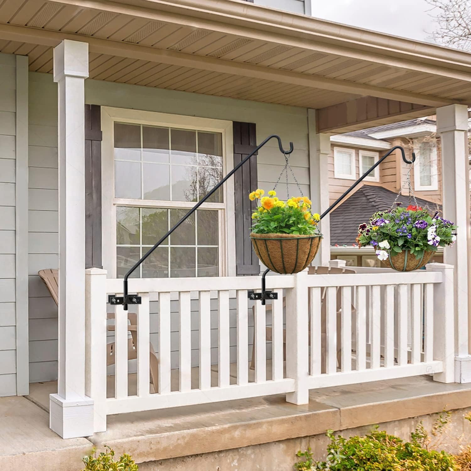 • High Quality Railing Hooks: The shepherd hooks for decks are made of heavy duty steel. The surface is coated with a black powder coating, which can be used outdoors for a long time even in bad weather and is not easy to rust. The sturdy brackets and curved rod tips help securely hold items in place.