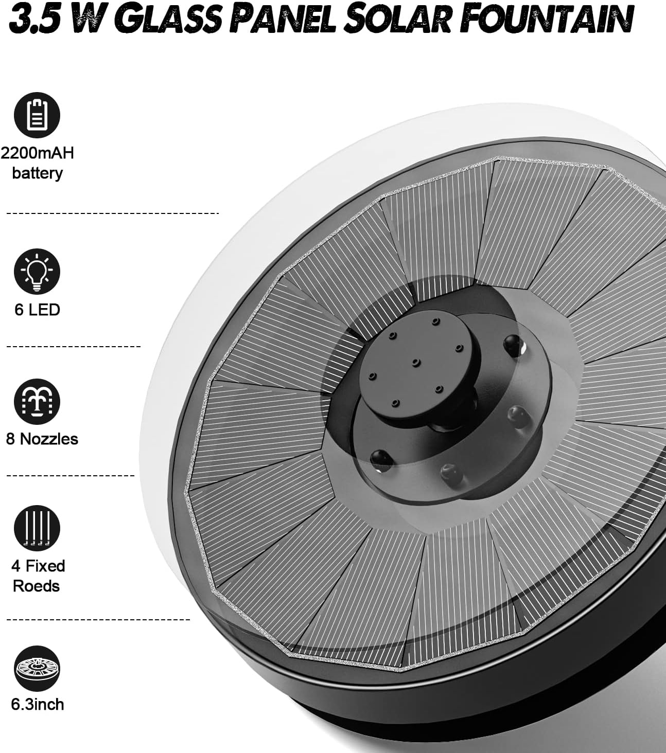 Solar Fountain Glass Panel with 2200 mah Battery, 3.5W Floating Solar Water Fountain with 4 Fixed Rods, Solar Fountain Pump for Bird Bath, Garden, Pond, Pool, Outdoor-Colorful Lights