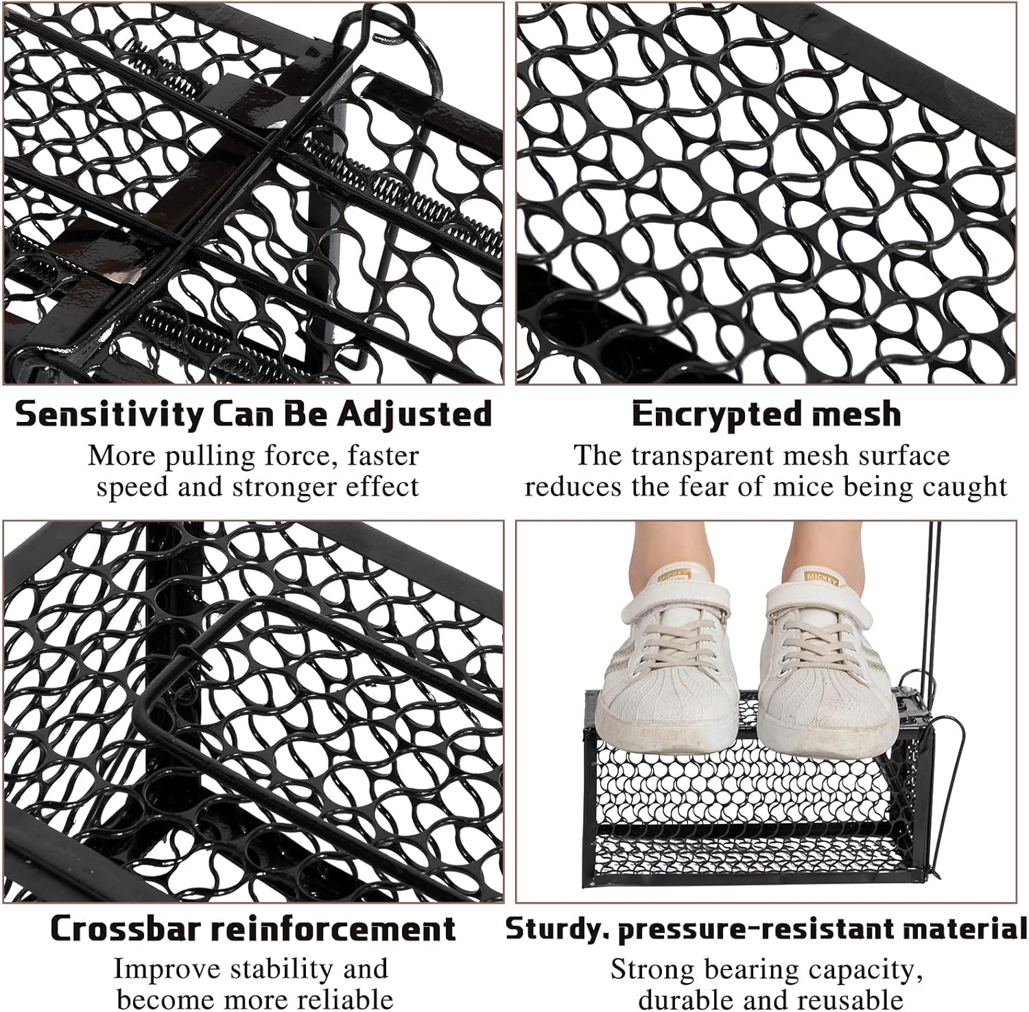 • Simple to Use: the mouse cage is easy to use, you simply lift the door and place the bait on the pedal, once the mouse enters the cage, touch the trigger and the door will immediately lock automatically and leave the critter inside