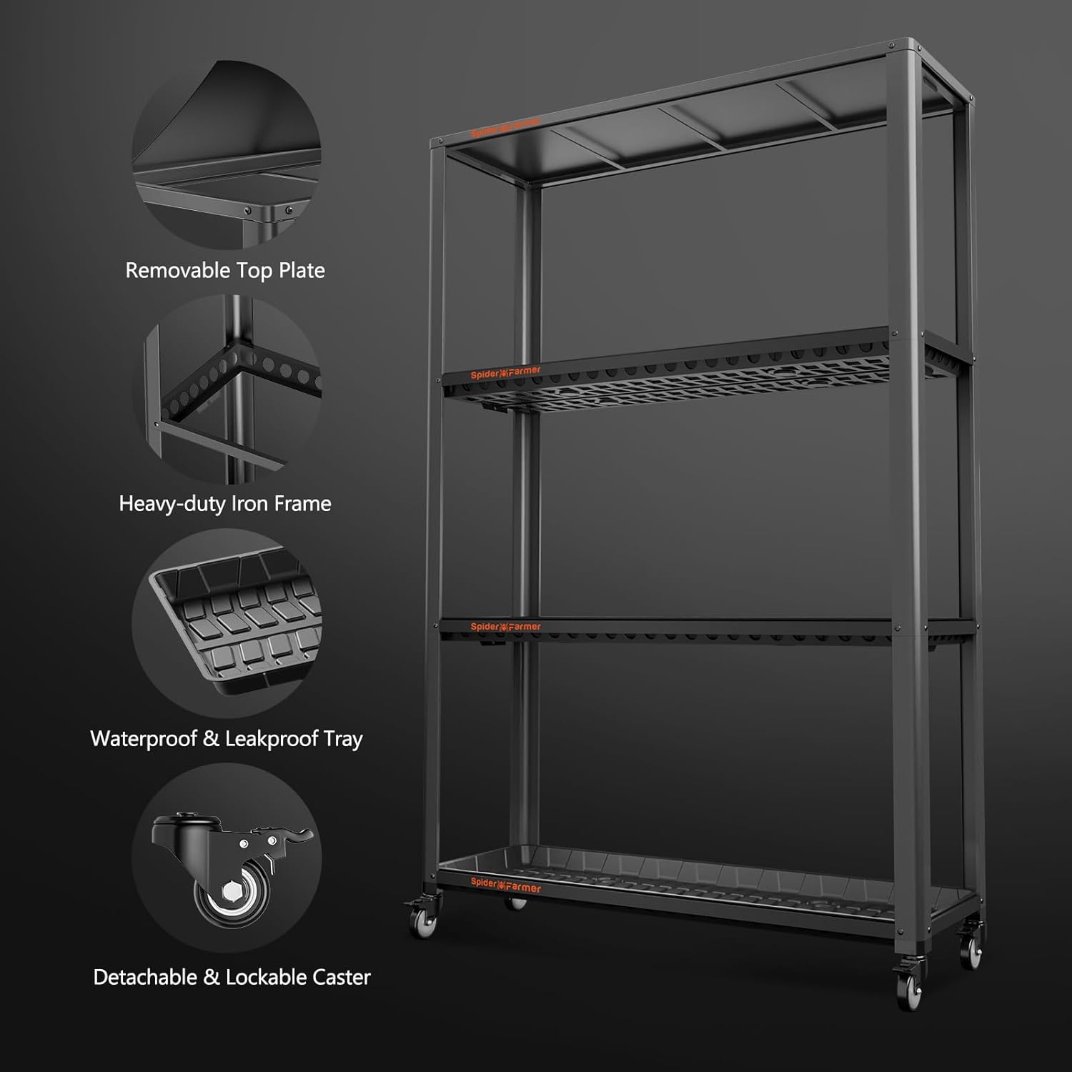 • 𝐄𝐚𝐬𝐲 𝐭𝐨 𝐀𝐬𝐬𝐞𝐦𝐛𝐥𝐞 & 𝐌𝐨𝐯𝐞: Designed for quick setup, the Spider Farmer plant stand can be assembled in 20 minutes using the included Allen wrench and stainless steel screws. It features four lockable caster wheels made from durable polyurethane, offering smooth mobility, shock absorption, and floor protection. Move the stand effortlessly to adjust for seasonal changes or lighting conditions, then lock the wheels in place for stability.
