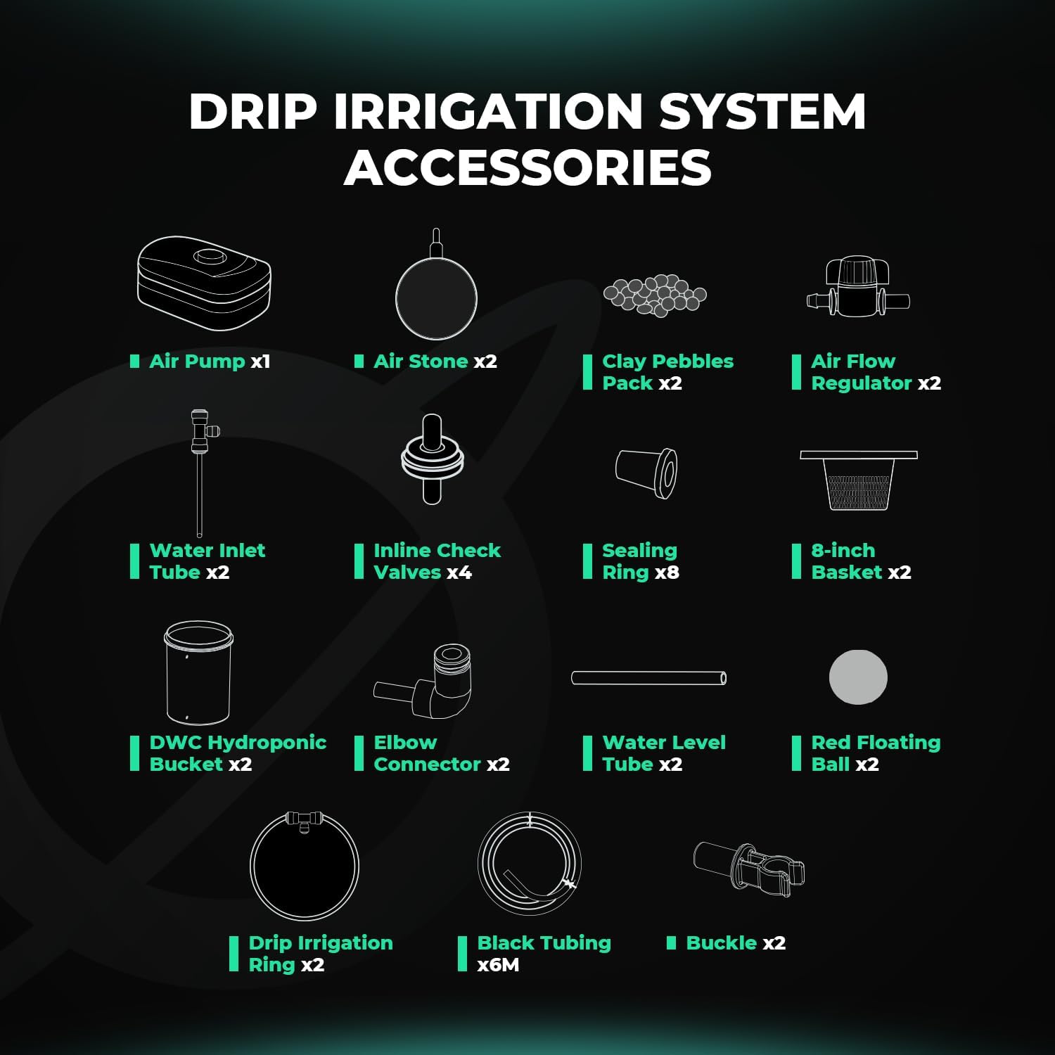 • 【DWC HYDROPONICS SYSTEM INCLUDE】2Pcs 5-Gallon Buckets, 8W Air Pump, 2Pcs Air Stone, 2Pcs Top Drip Kit, 6M Air Tubes, 2Pcs Visual Water Level Indicators, 4Pcs Check Valve, 2Pcs Air Flow Regulator, 2Pcs Clay Pebbles.