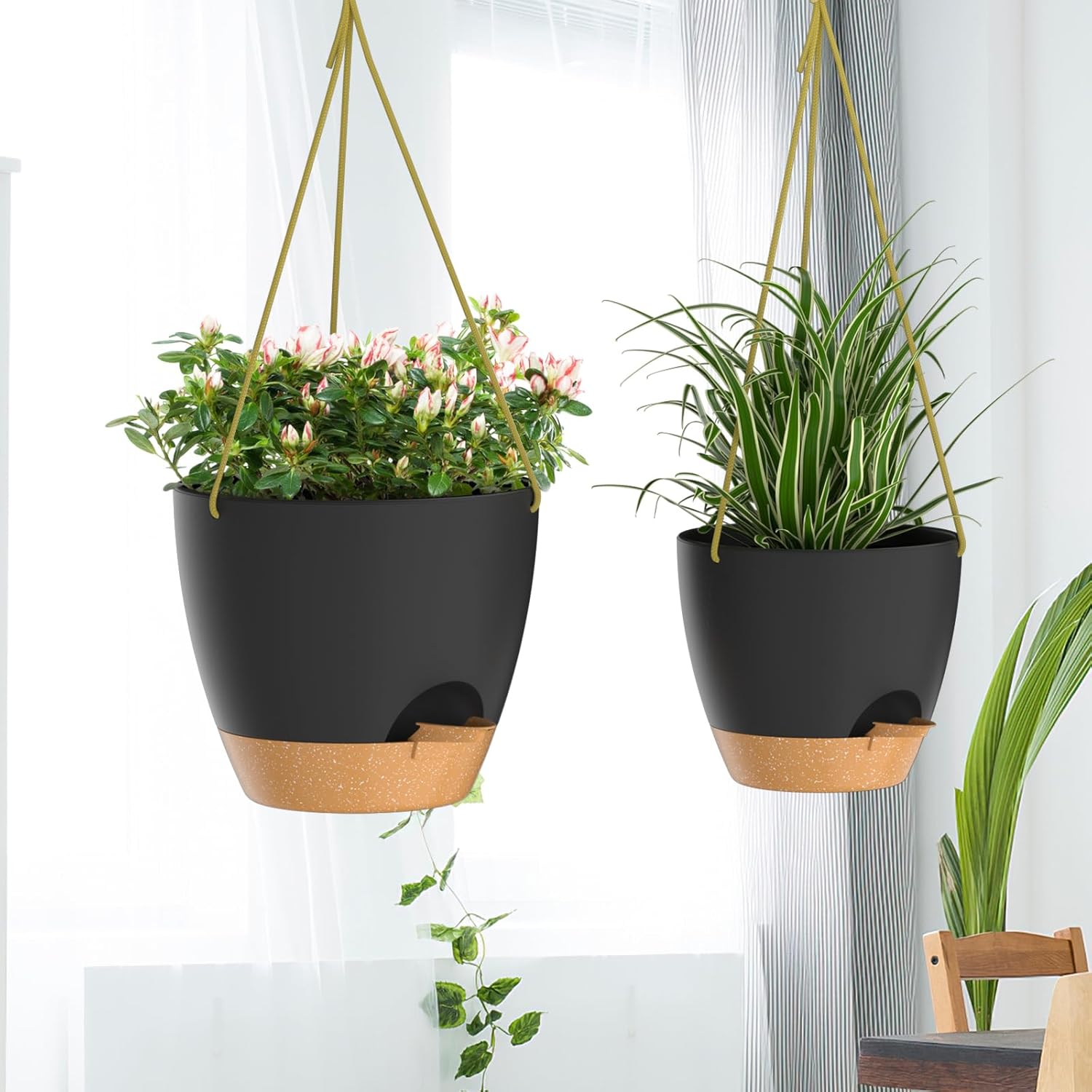 • Self Watering Hanging Planters: The hanging planters have an absorbent cotton rope and a removable reservoir. It ensures that your plants are not soaked in water and prevents root rot. The large capacity saucer provides enough water for your plants and the plant pots will keep them growing normally for 7-10 days, so you don't have to worry about your plants drying out even if you are travelling far away;