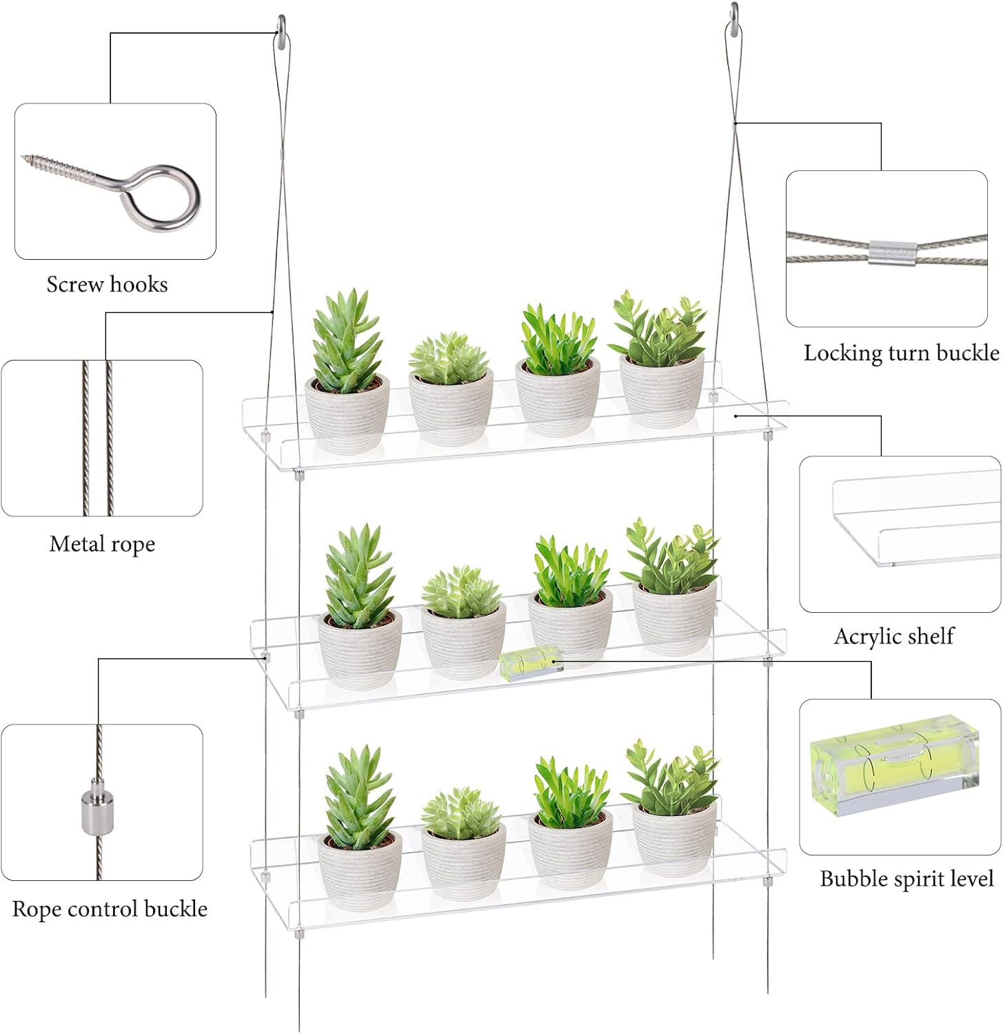 • EASY TO INSTALL: The product needs to be combined, and the package contains assembly instructions.The Rope Can Be Freely Adjusted By Moving The Knot To The Right Height To Keep The Shelf Flat For Your Convenience To Place Items. Follow the install instructions, efficiently and quickly create a stunning window garden.