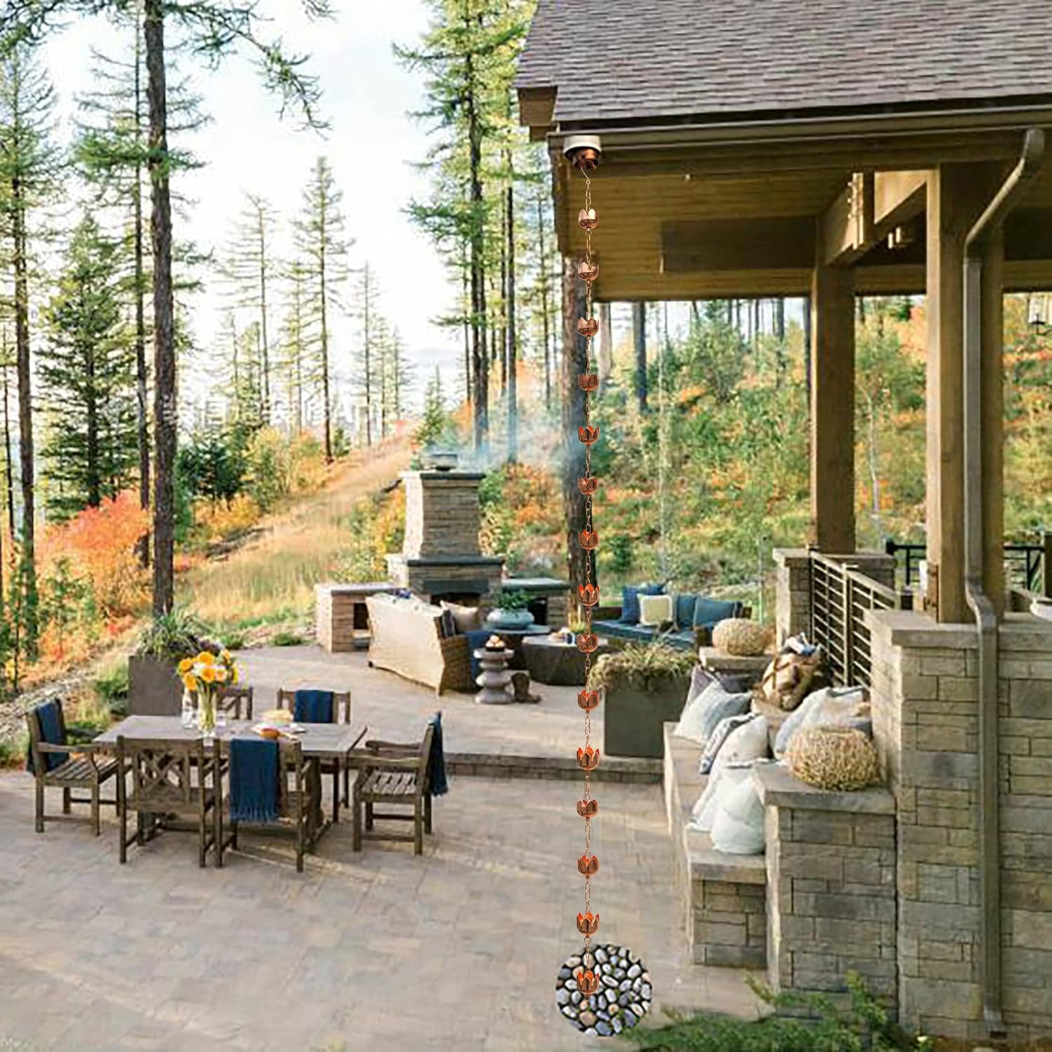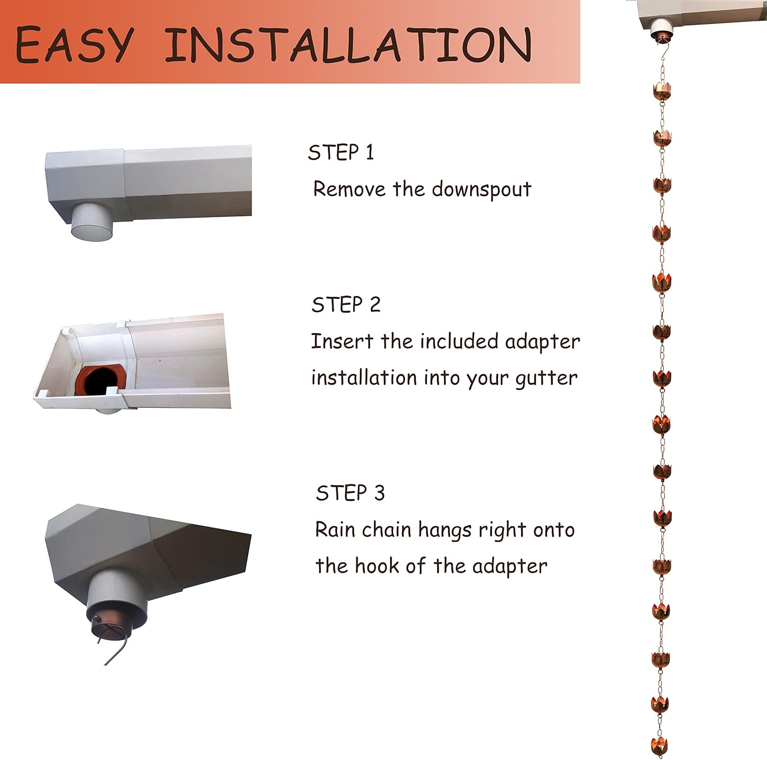 • Easy installation: Modern circular connection technique allows for height adjustment; connect the bottom ring to ground fixture or water basin; hook the top wherever you want to hang rain chain. Free adapter provided.
