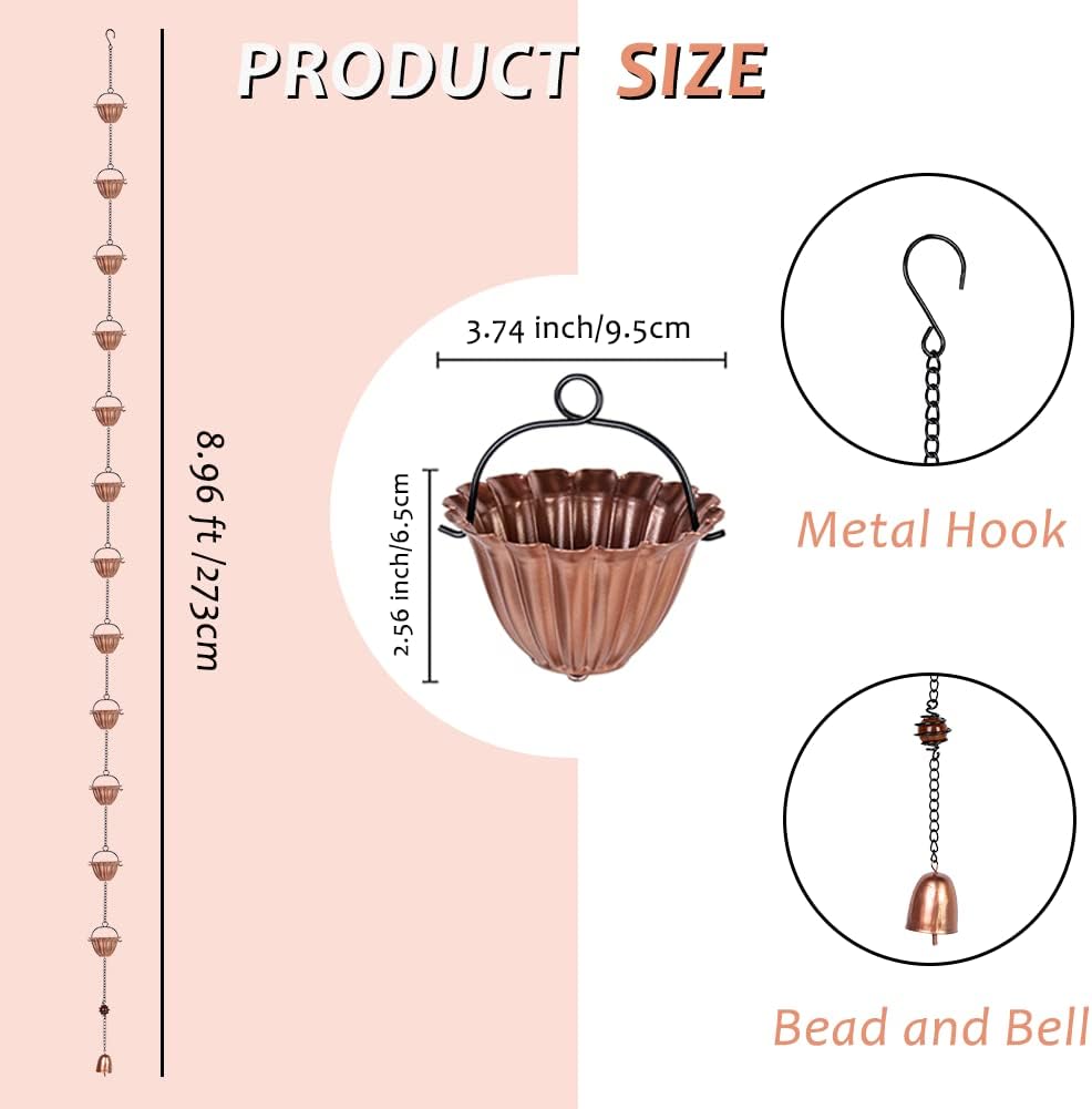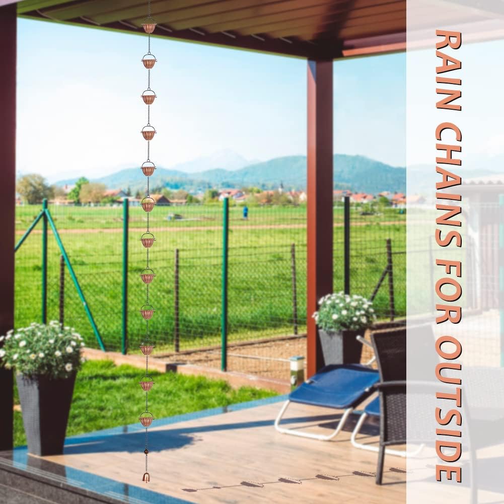 • Premium Material: The 9 feet Lotus rain catcher chain is made of excellent metal, making the rainchain stable enough and not easily broken by heavy wind and rain. Each cup is designed with a wide top mouth and narrow bottom to receive more rainwater and flow slowly along the chain