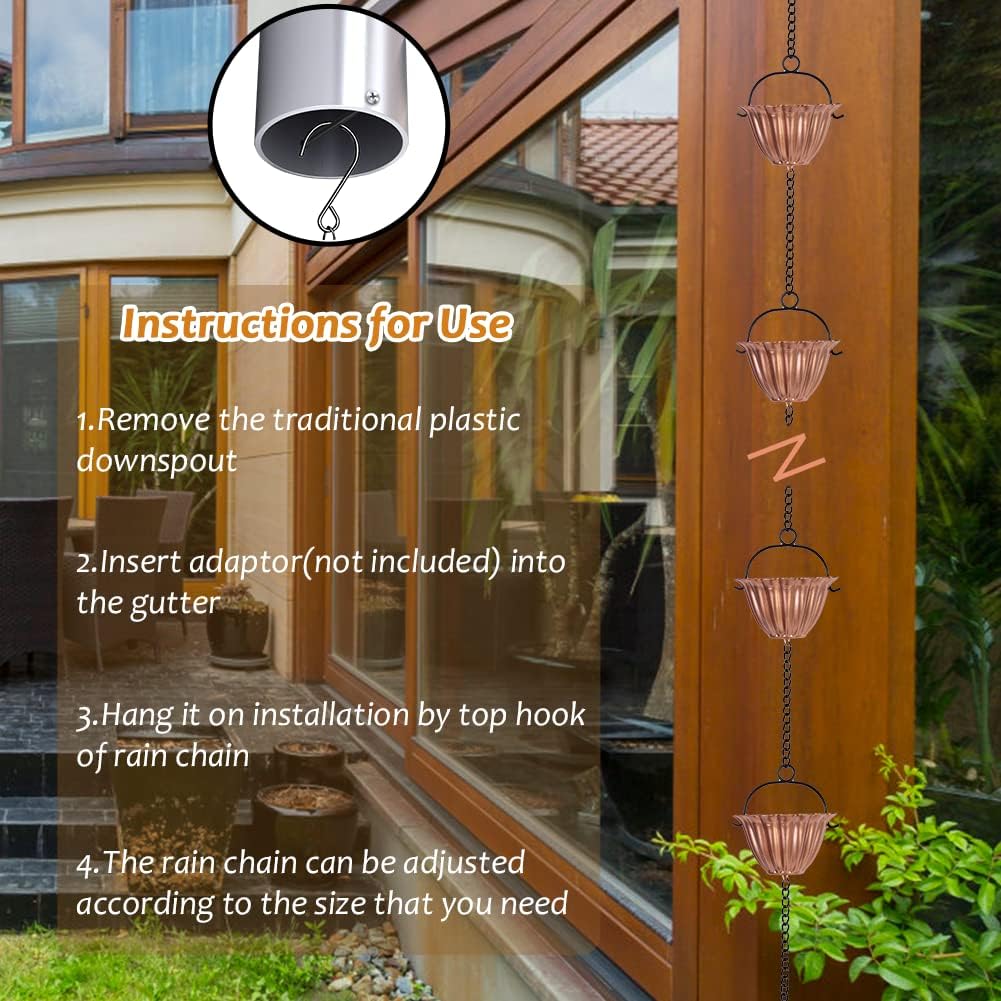 • Easy to Install and Use: No assembly required, the rain chain for outside is designed with "S" shaped hooks, simply hang the hooks on the adapter , it can be used to hang under the eaves. The length of the metal rain chain is adjustable, if the rain chain is too long, can use a tool to remove the chain