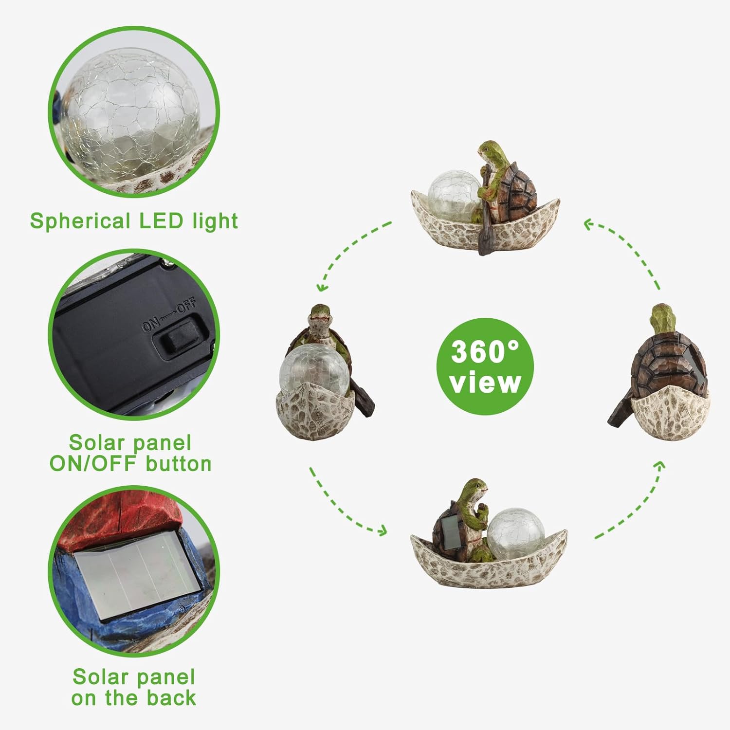 • 【Easy To Use】The patio Turtle ornament which just toggle the bottom switchand leave it in the "on" position in the daytime.The solar Turtle sculpture charge during the day and light up automatically at night.If the led lights don't turn on when you receive it that maybe caused by the long time shipping.Just place Turtle in the sunlight for a few hours,and the problem will be fixed.