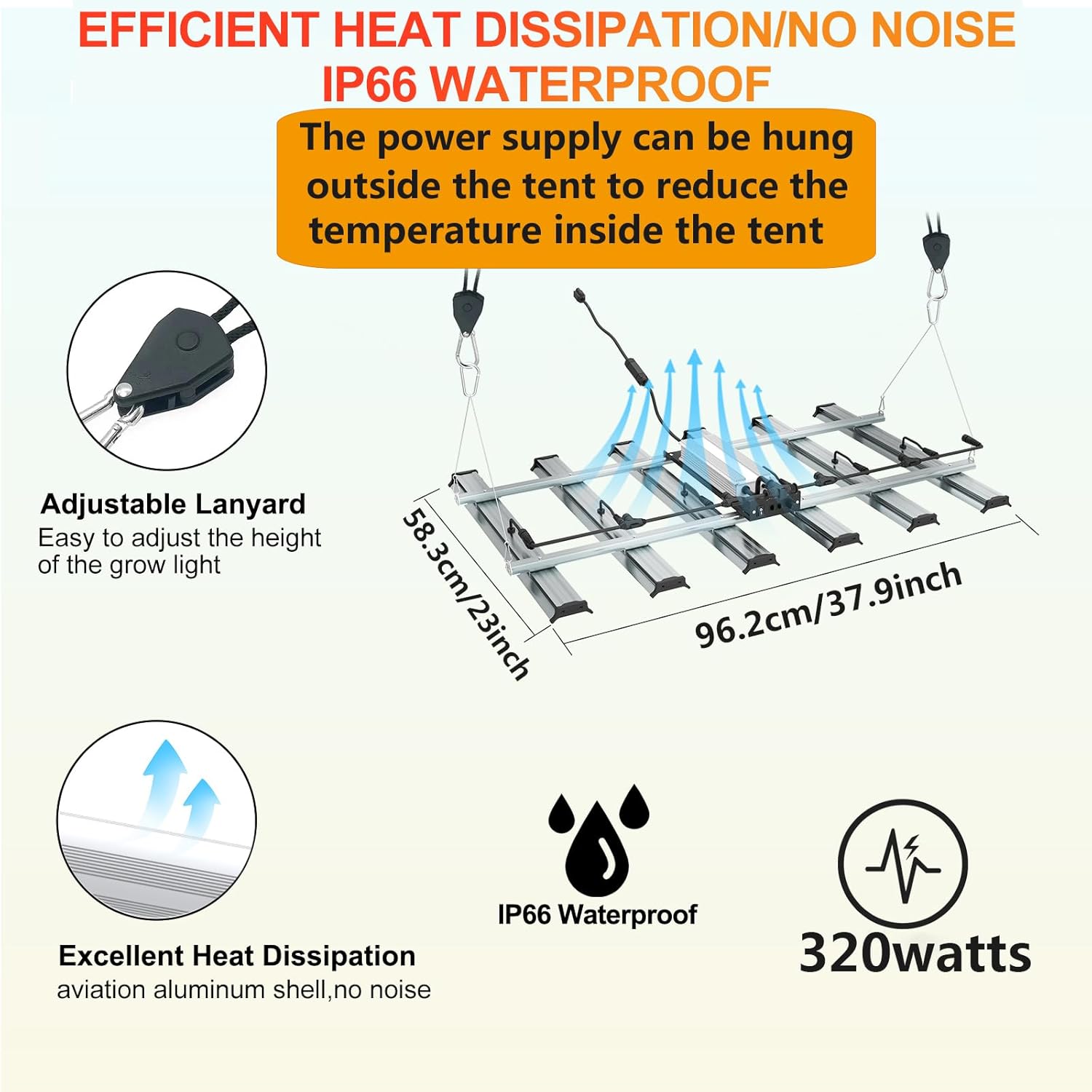 • 【Max Coverage Area Plant Lamp Full Spectrum】320W Full spectrum (380-410 nm, 660-665nm, 730nm,3200-4200K,4800-5000K) is perfect for veg to grow,6 LED grow lights bars , it can provide evenly distributed light intensity.It can coverage for 4x4ft of high-yielding full-cycle growth.