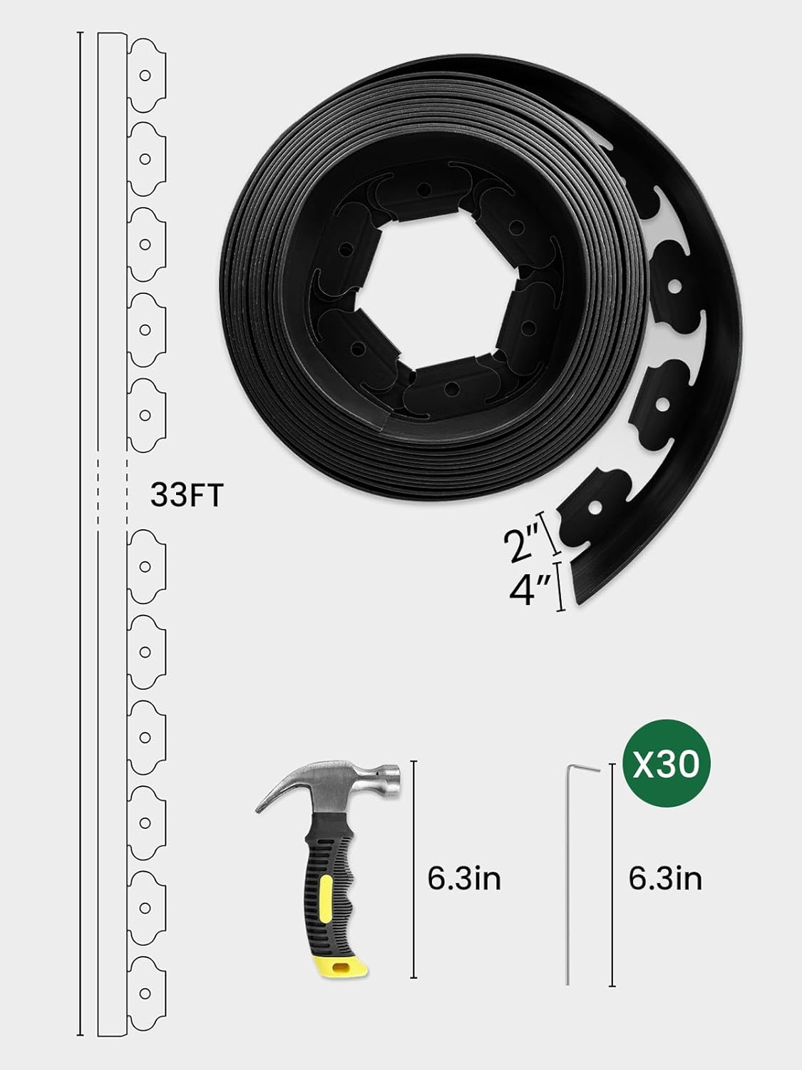 • ALL-IN-ONE KIT: the garden edging border comes with everything you need: 33 ft x 4 inch tall flexible edging for landscaping, 30pcs 6.3" galvanized steel spikes, and a 6.3" hammer. No need to prepare extra tools — start your landscaping project right out of the box.