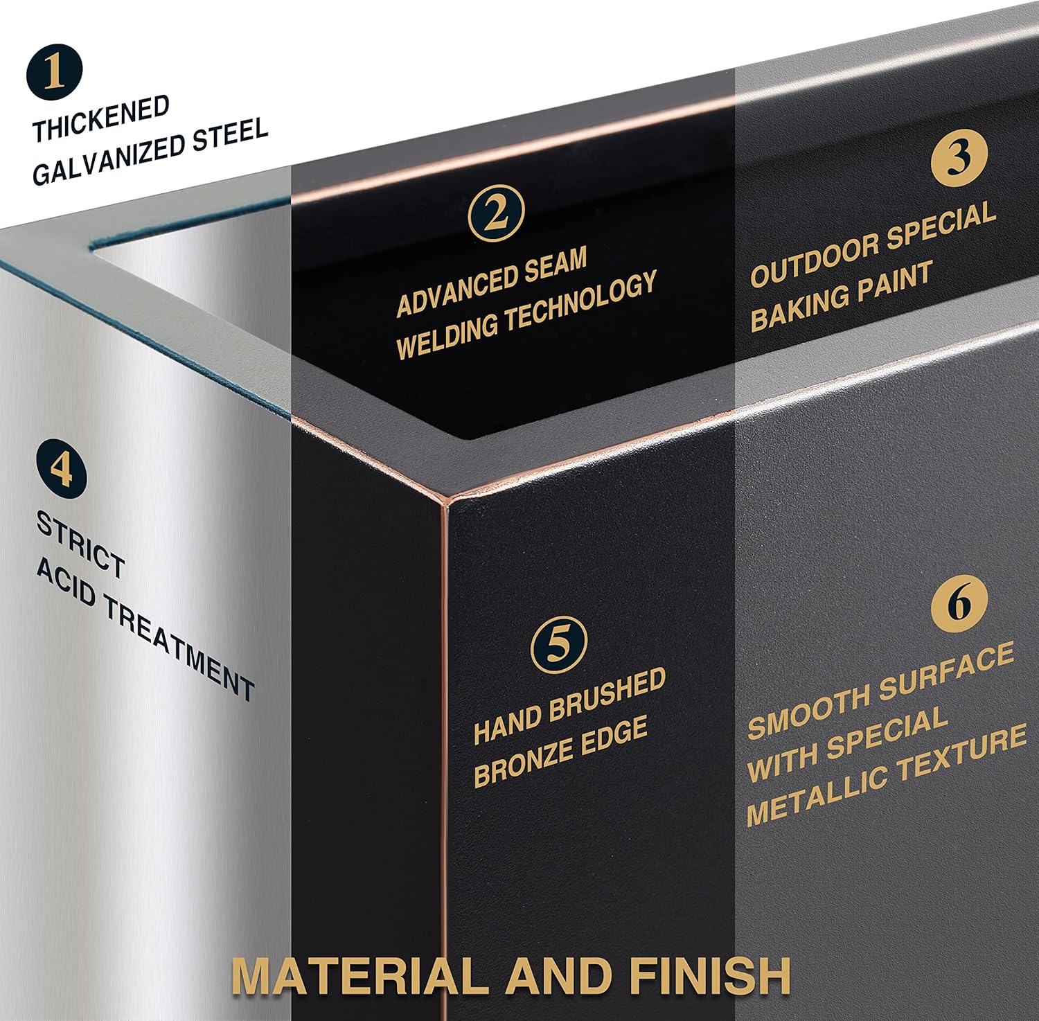 • 【No Assemble and Seamless】Our flower box arrives fully assembled and requires no additional setup. Simply unpack and place it in your desired location for instant use, saving you time and effort. Crafted using advanced fully automatic welding technology, this flower box features a seamless, one-piece design with a smooth and even surface, ensuring long-lasting durability and a polished appearance.