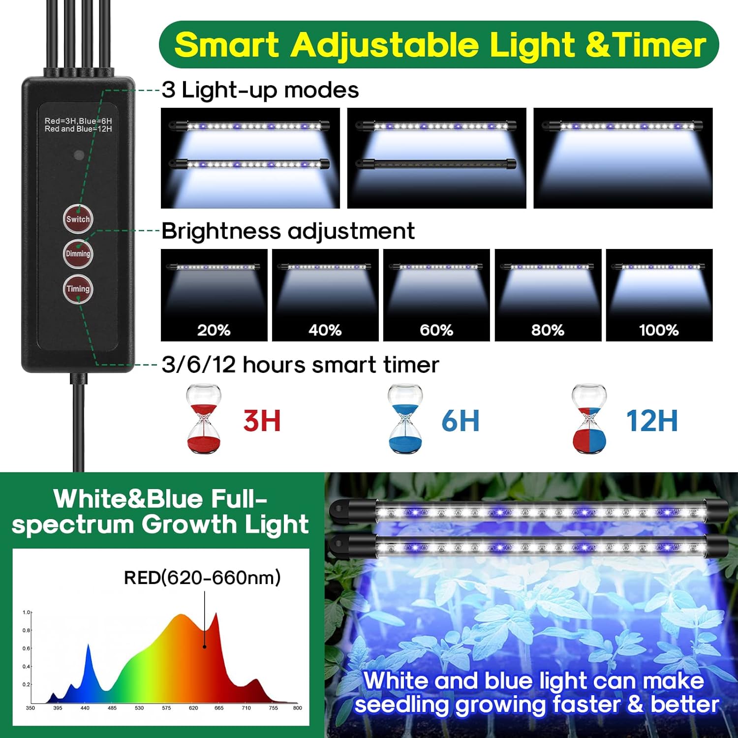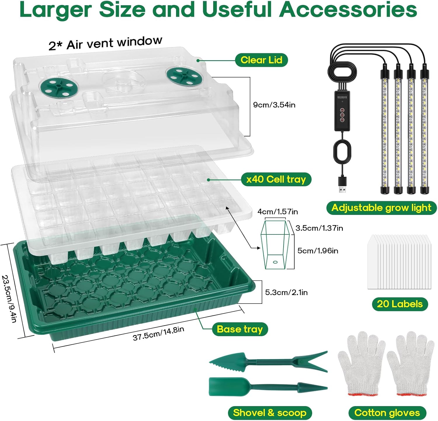 • 【360°Spectrum Seed Starter Tray With Grow Light】 Larger grow light cover spectrum for better seedling grow, the seed started kits have 4 full spectrum strip seed grow lights insert on the Dome of the garden plant starter kit. Now you can adjust and timed the light as you need! Withe& blue Light will help seedling growing faster and better. You can use this product by USB port or just plug-in,3 lighting modes & 3 timing functions (3H/6H/12H) & 5 brightness modes, the best tool for your garden