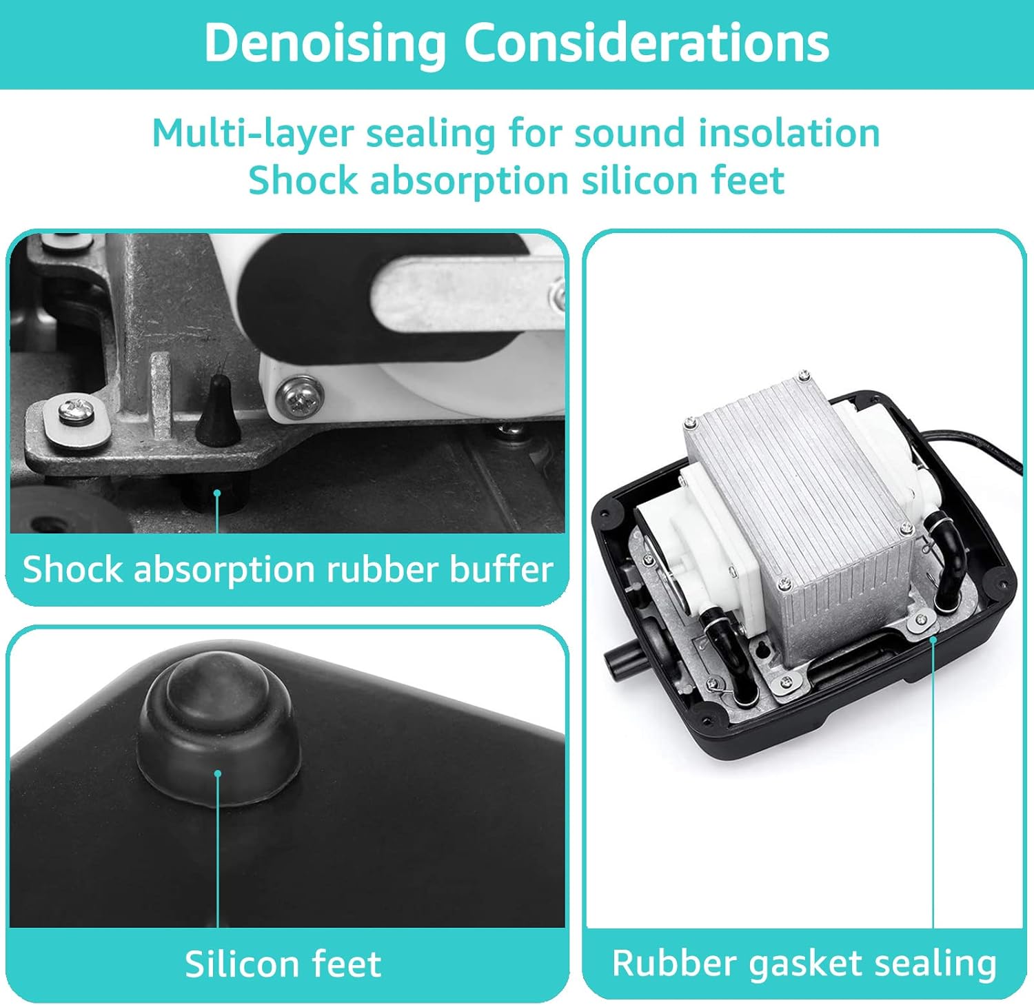 • QUIET – This linear air pump is designed with multiple denoising considerations to achieve low noise operation.