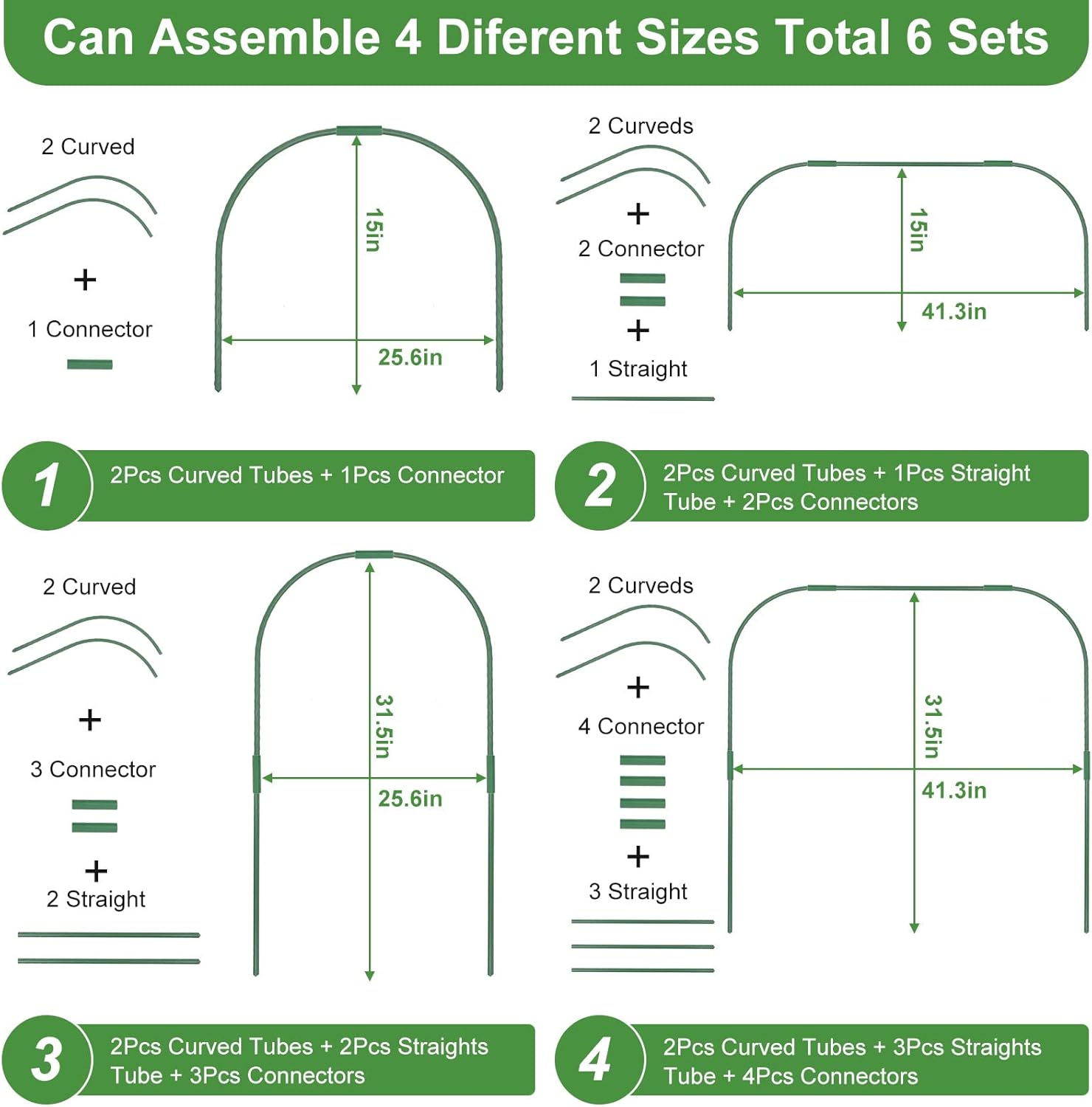 • 🌱【Greenhouse Hoops DIY Kit Include】: Garden Bed Hoops contains 16 curved tubes, 24pcs Stright Hoops,32 pcs connecting pipes and 24pcs clips (a total of 8 sets of greenhouse hoops 41.3" in Wide, 31.5" Height) You can combine with hoops to DIY your own grow tunnel, it can be DIY 4 Different Types.And you can use the clips to fix the greenhouse covering.