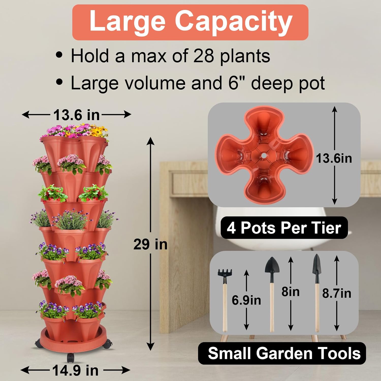 DUNCHATY Stackable Planters 7 Tier Vertical Garden Planting Tower Planters Strawberry, Herb, Flower, and Vegetable Planter Indoor Outdoor Gardening Pots with Removable Wheels and Tools