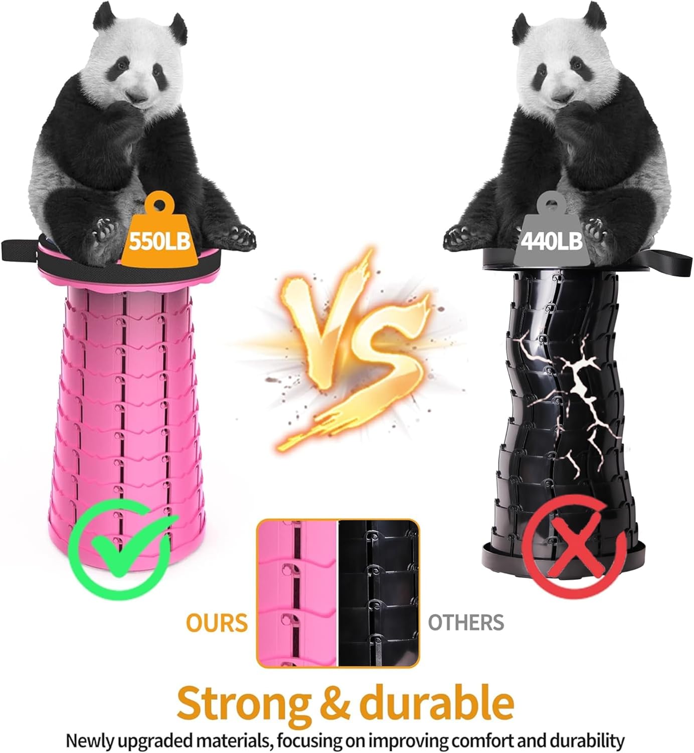 • 【ULTRA STABLE PERFORMANCE】 Upgraded telescoping structure and reinforced clasps give the foldable stool extraordinary stability and rigidity. Our Portable Travel Seat can support up to 550 lbs, far stronger than other similar products. Side support and the capacity of resistance to tilt are also reinforced, which makes the stool more sturdy and durable, ensure safety.