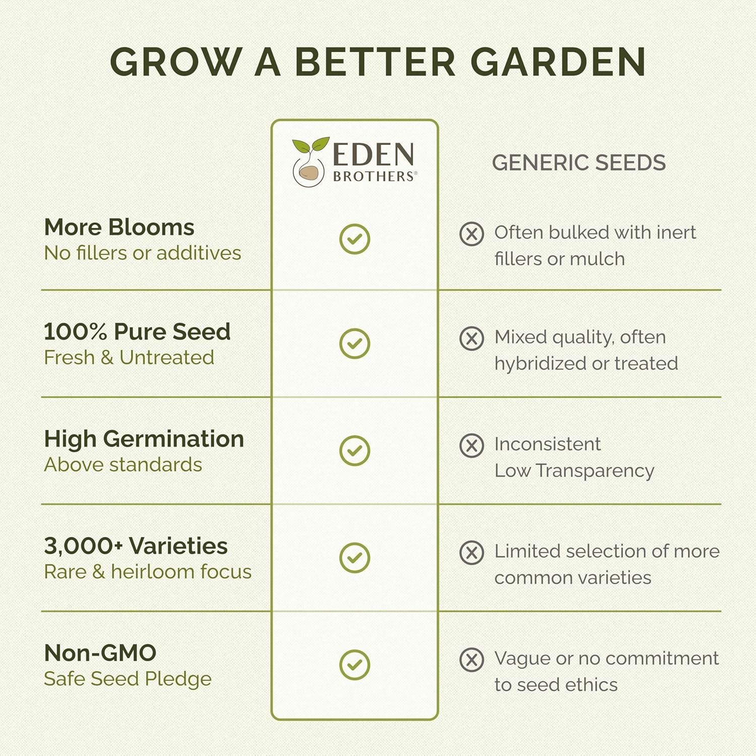• High Germination - Eden Brother seeds are fresh, 100% pure, high germination, and non-GMO. Always. Our germination rates far exceed industry standards when planted according to instructions.