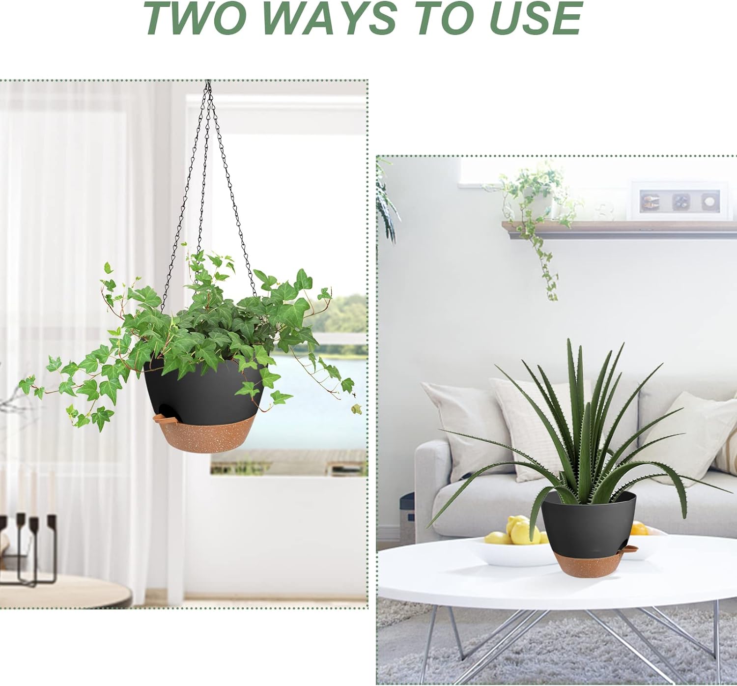 Hanging Planters for Indoor Outdoor Plants, 2 Pack Self Watering Hanging Pot with Drainage Holes & Removable Tray (Black, 8'')