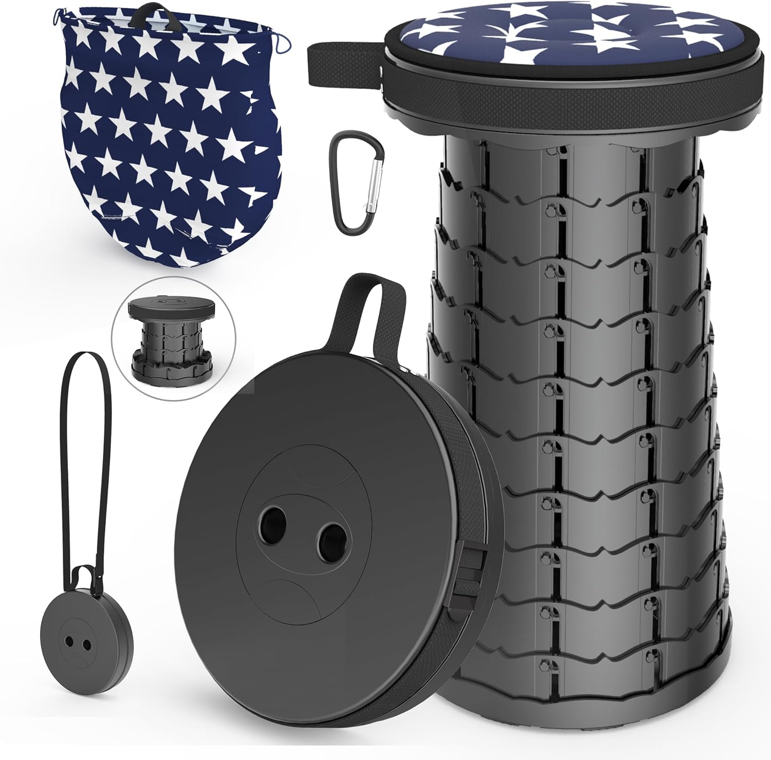 • 【LIGHTWEIGHT and PORTABLE】 This Telescoping Stool is only 9.8" in diameter and the weight is only 2.2Ibs. It can be put in a suitcase or storage box. The adjustable strap makes the chair easy to carry or hang on the shoulder. This ideal chair allows you to sit down anytime, anywhere.