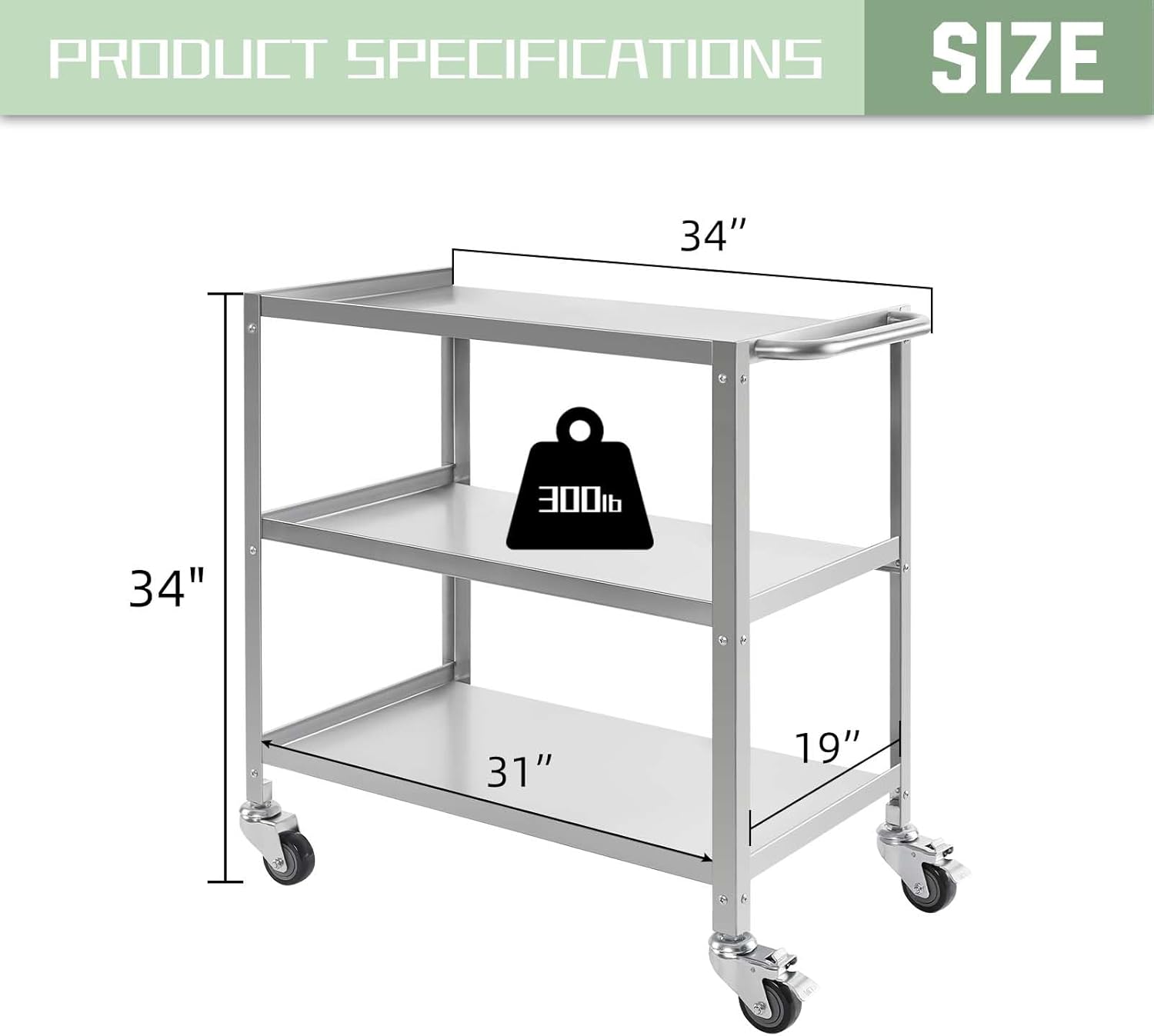 Hally Stainless Steel Utility Cart 3 Tier NSF Commercial Heavy Duty Metal Mobile Food Rolling Cart with Handle and Wheels for Kitchen, Restaurant, Hospital, Laboratory and Home, 31" L x 19" W x 34" H