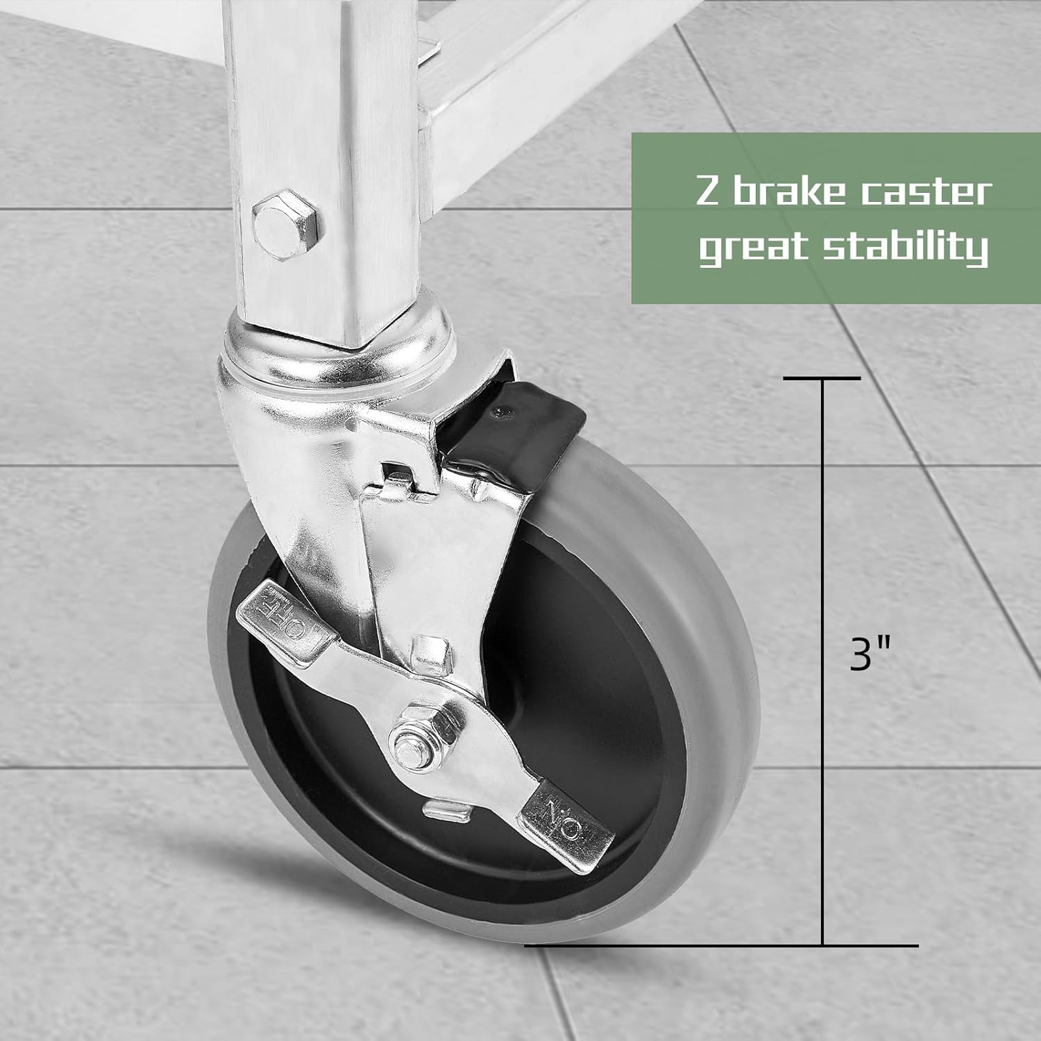 • 360° Universal Casters: The commercial grade utility cart is equipped with four 3" casters that can rotate 360° and transport items quickly and smoothly. Two casters are equipped with brakes to firmly fix the cart in place, increasing stability