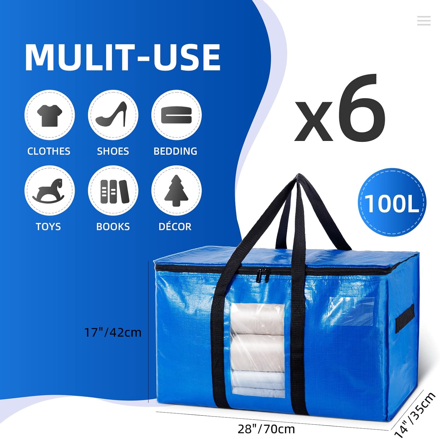 • [More Details]: The U-shaped handle design wraps the blue packing bags from the bottom to the side, which improves the load-bearing capacity of the bottom and easily stores 100 pounds of items. The front transparent window and the label card slot allow you to quickly identify the stored items