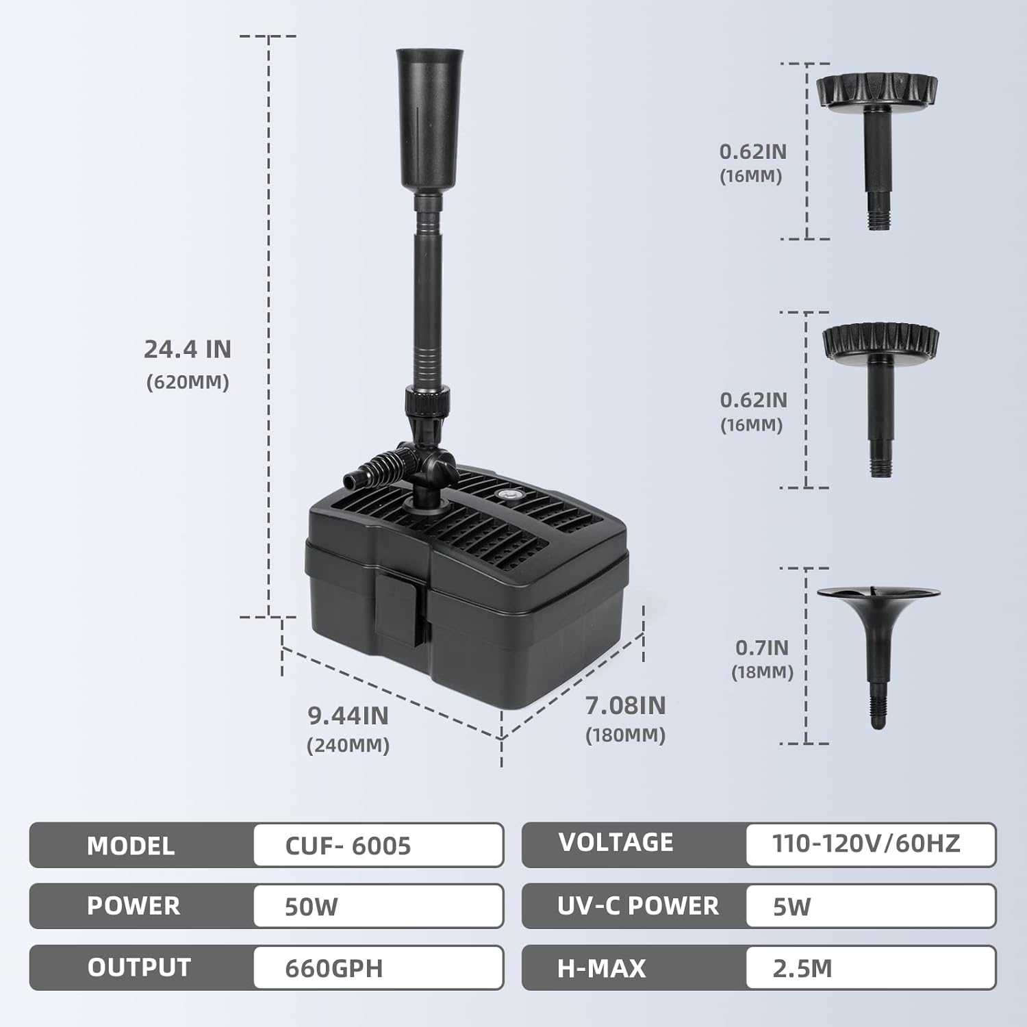 • What You Get? One 660GPH pond filter pump, three fountain heads and one user manual. ANBULL pond filtration kit will not only keep this pond water clean but add a great deal of character to your pond!