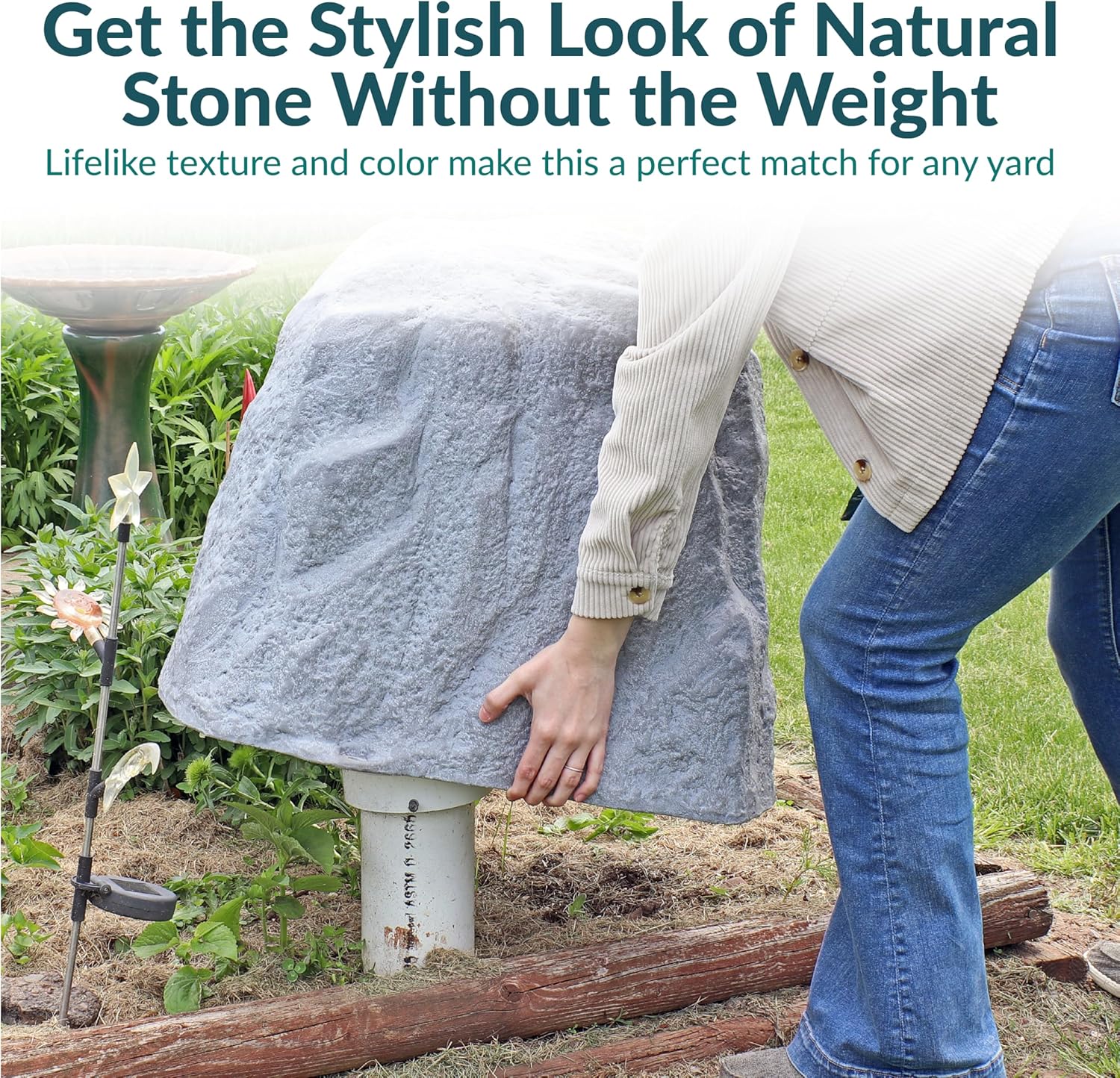 • CONCEALS LANDSCAPE UTILITIES: Place this fake rock cover over a septic tank, well, sprinkler valve, pipe, or other unsightly objects in the yard. Push the stakes into the ground through the holes at the bottom of the rock to secure it over any object.