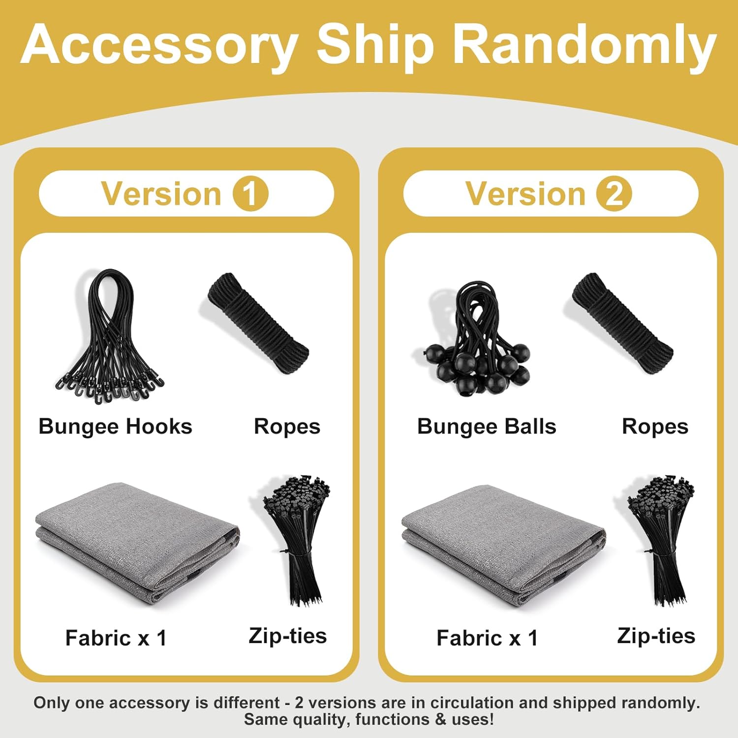 • Accessory Updated: Accessories have been updated from [Zip-ties, Ropes, Bungee Balls] to [Zip-ties, Ropes, Bungee Hooks]. Both versions are in circulation and will be shipped randomly. Easy to Install: With included grommets on each sides every 2 ft space and fixing accessories, you can easily attach the pergola shade cover to various structures while ensuring uniform stress. Whether you're looking to cover your backyard, carport, or playground, you can have it up and providing shade in no time