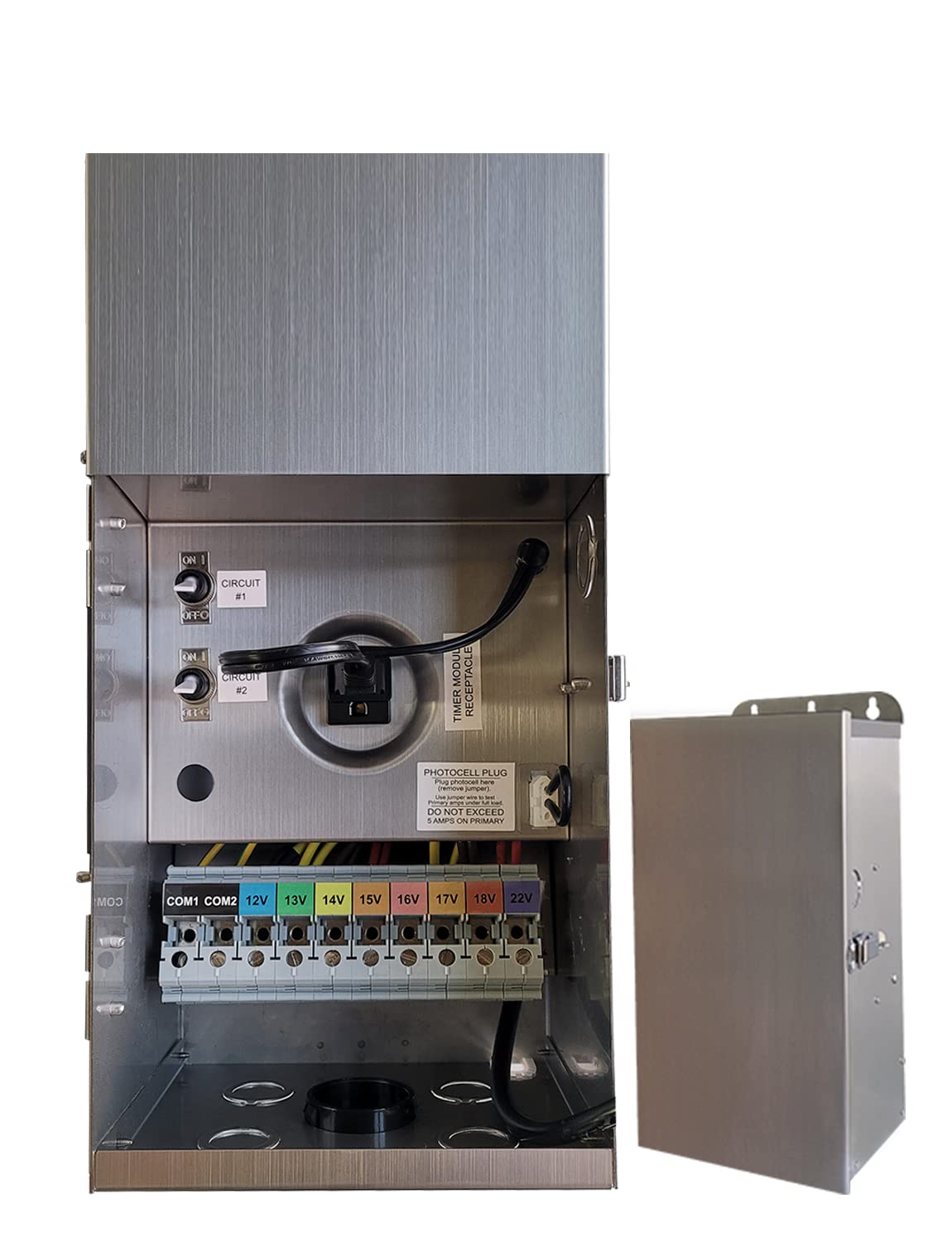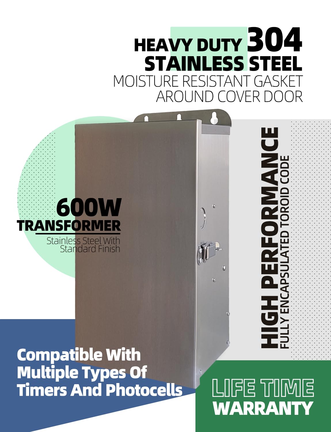• Durable & Waterproof:Top grade 304 stainless steel outer shell does not corrode, protects the 600W transformer against all severe weather conditions.The transformer has a locking latch, which can be locked to prevent children from opening it and prevent rainwater from entering.Mounting slots on top and bottom for quick mounting without templates. Removable bottom plate with pre-punched knockouts, allowing great access during installation.