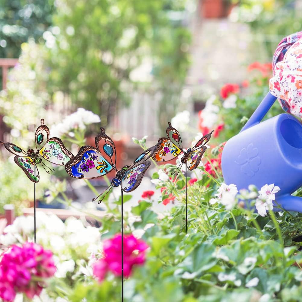 • Garden Stakes Decor:3 pack of butterfly garden stake decorations in different colors, made of advanced rust resistant metal and stained glass. Put butterfly decor in your garden, yard, or wherever you want them to be, they will give you a fresher and more natural feeling