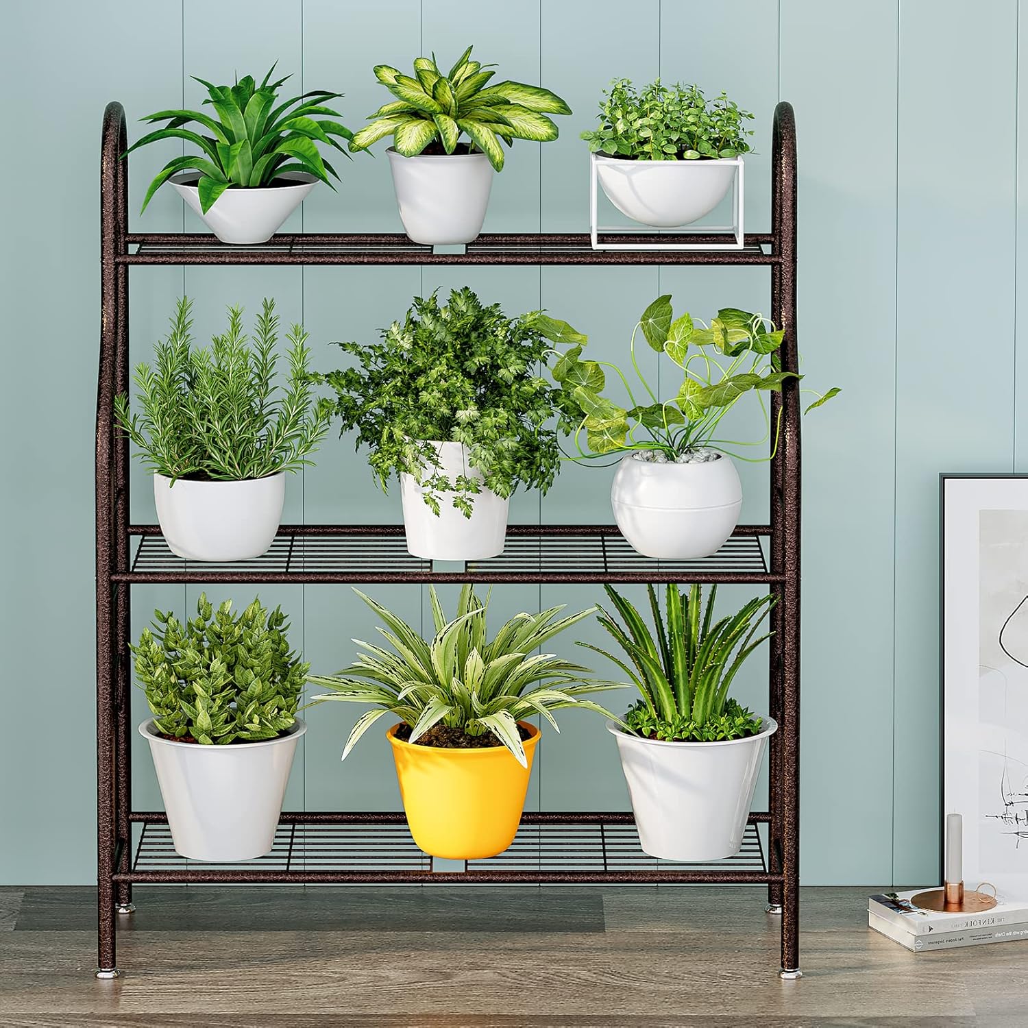 • WATERPROOF ANTI CORROSION The 3 tier plant stand is made of high quality iron, the matte powder coated tubular will not rust or Waterproof, easy to clean and can be used indoors or outdoors.