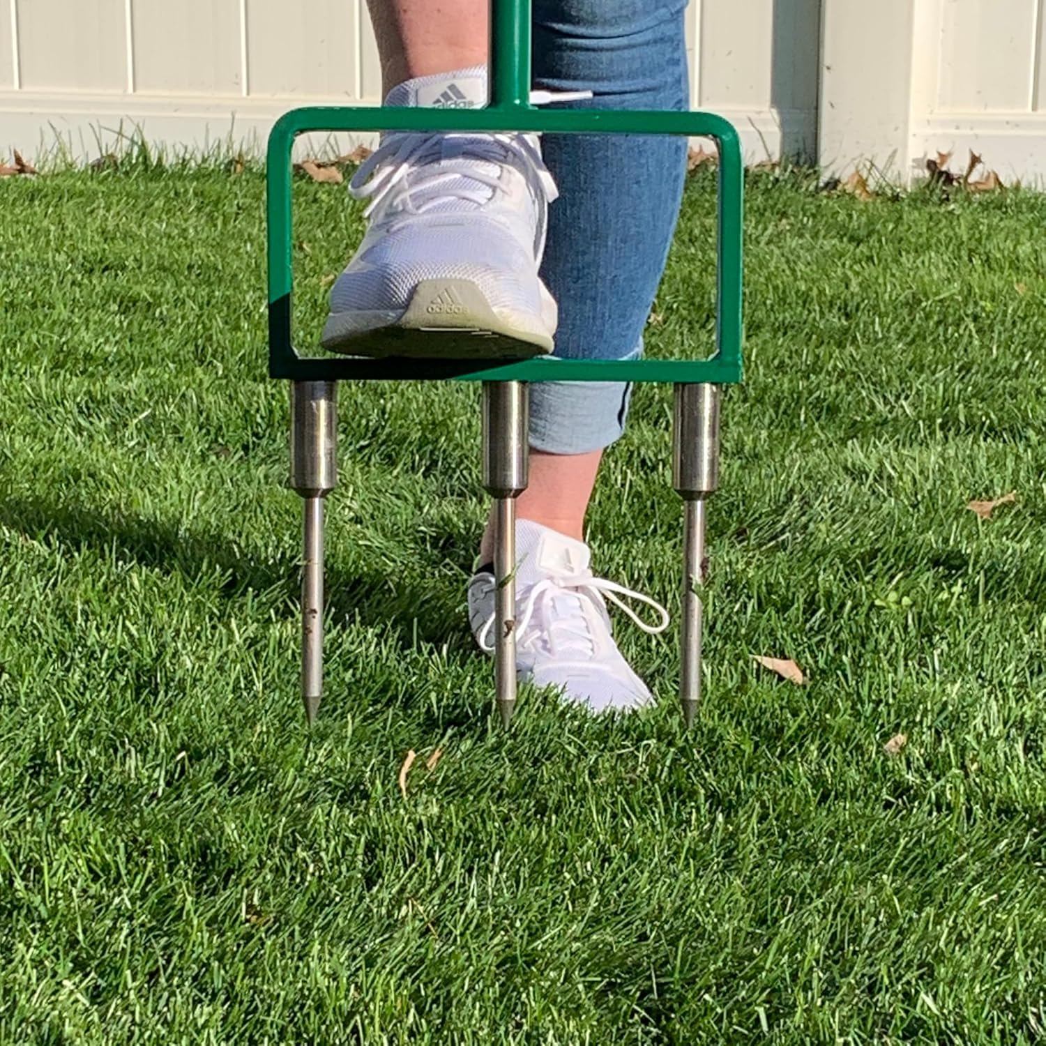 • INNOVATIVE SOLID SPIKE TINES: Landzie's innovative solid spike tines are designed to revolutionize lawn aeration. The three solid, stainless steel spike tines penetrate deep into the ground without removing plugs of soil, making the core aerator lawn tool more efficient at aerating hard, dry soil, making it a faster, more effective lawn aerator tool. The spike tine fork aerator can reach tight corners and edges, providing complete coverage for your lawn.
