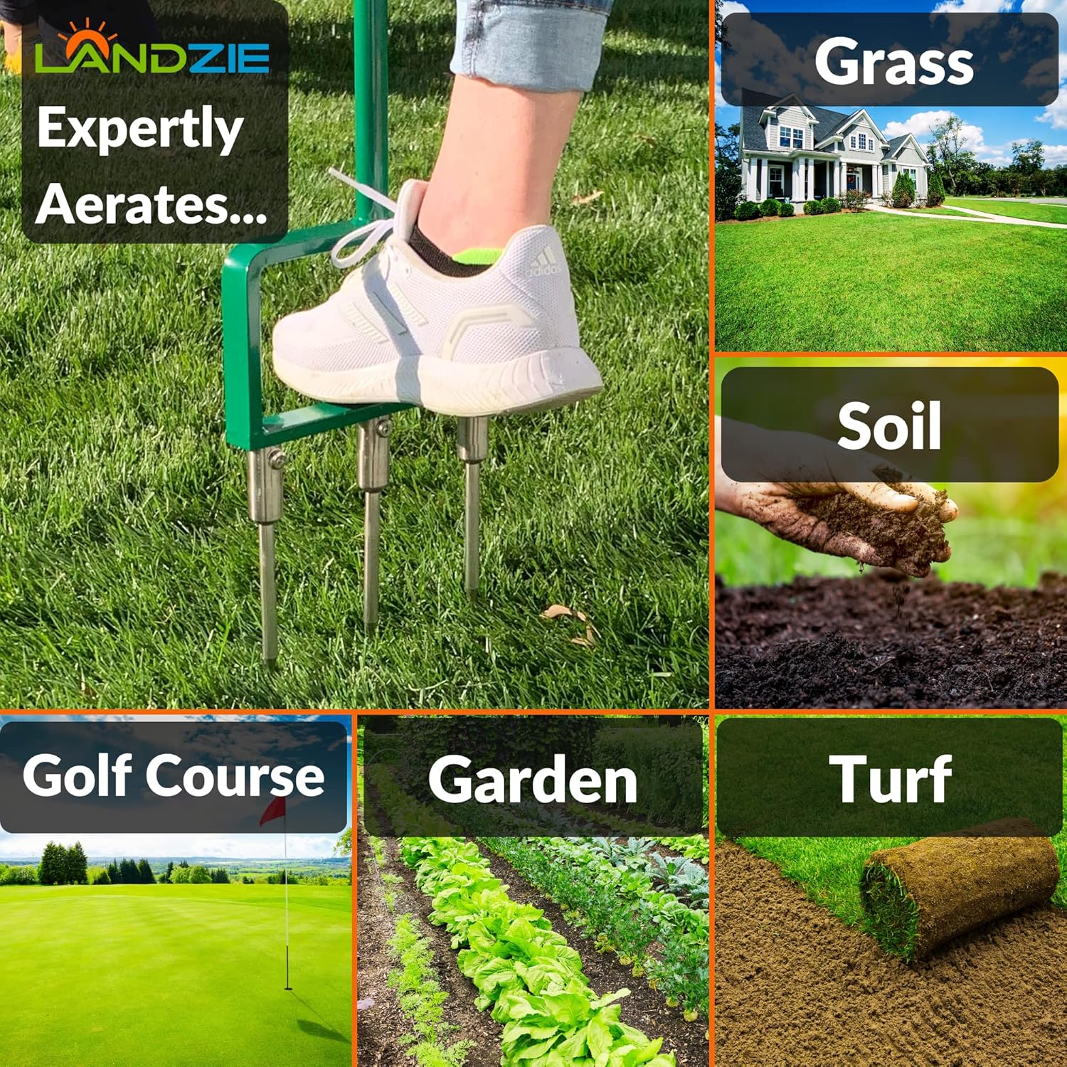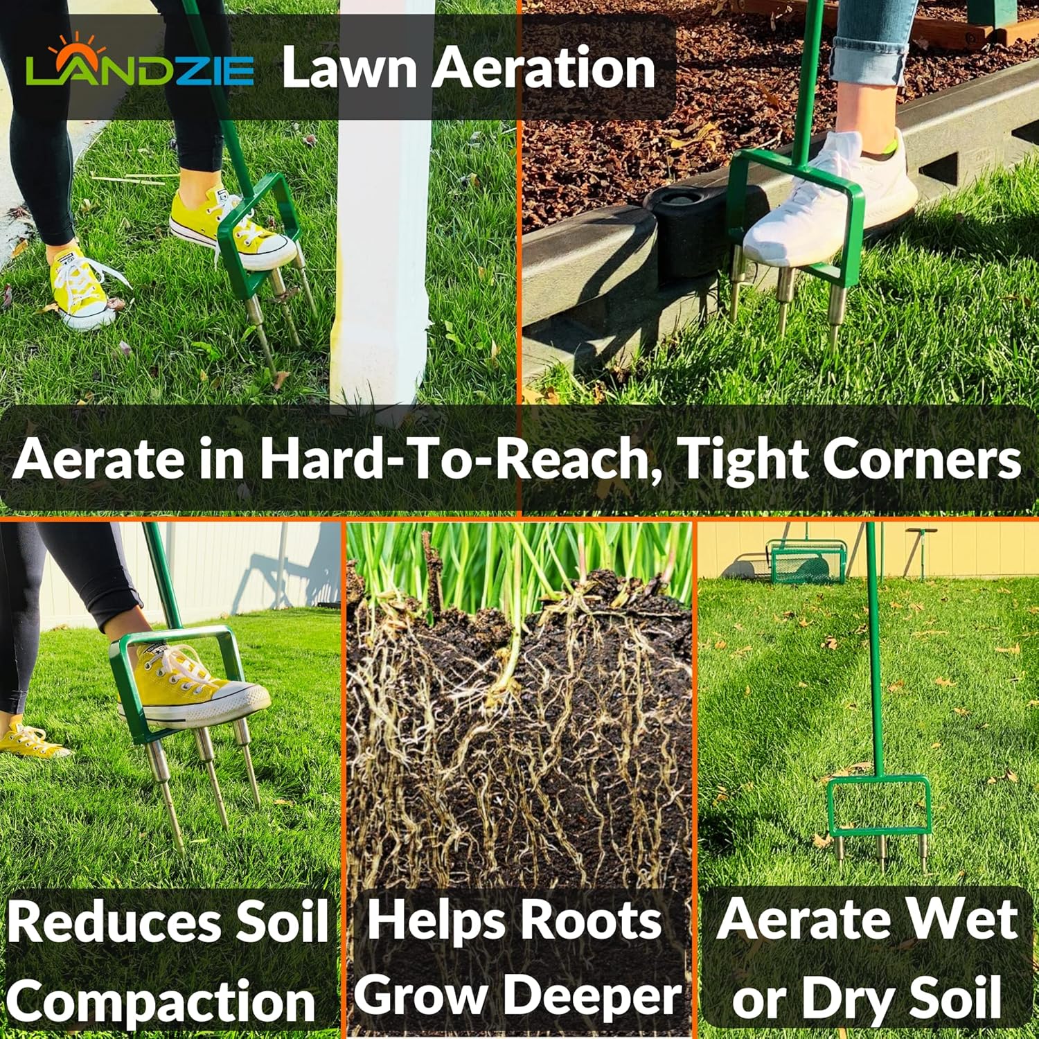 • HAVE THE LAWN OF YOUR DREAMS: Revitalize your lawn this season by using the Landzie Fork Lawn Plug Aerator to remove compacted soil and thatch and promote healthy grass growth throughout. Aerator coring your lawn encourages healthy root growth, enhances resistance to drought and flooding, and reduces the need for excessive amounts of fertilizer. USE your Landzie Soil Aerator with the Landzie Spreader (B07ZQSV81S) and the Landzie Lawn Level (B095KSKXPQ) for a lush and level lawn this season.