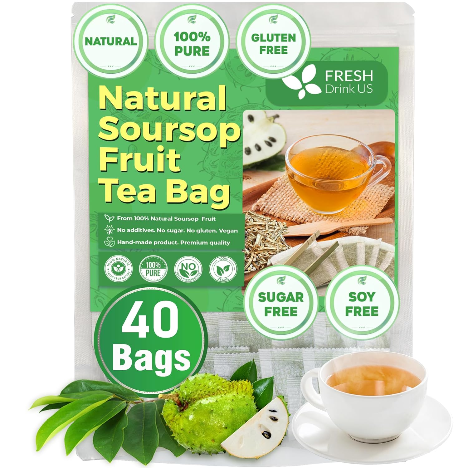 FreshDrinkUS, 40 Premium Soursop Graviola Fruit Tea Bags, 100% Natural and Pure from Soursop Fruits, Made With Natural Materials-Corn Fiber Tea Bag, Sugar/Caffeine/Gluten Free, Hoja Guanabana Tea